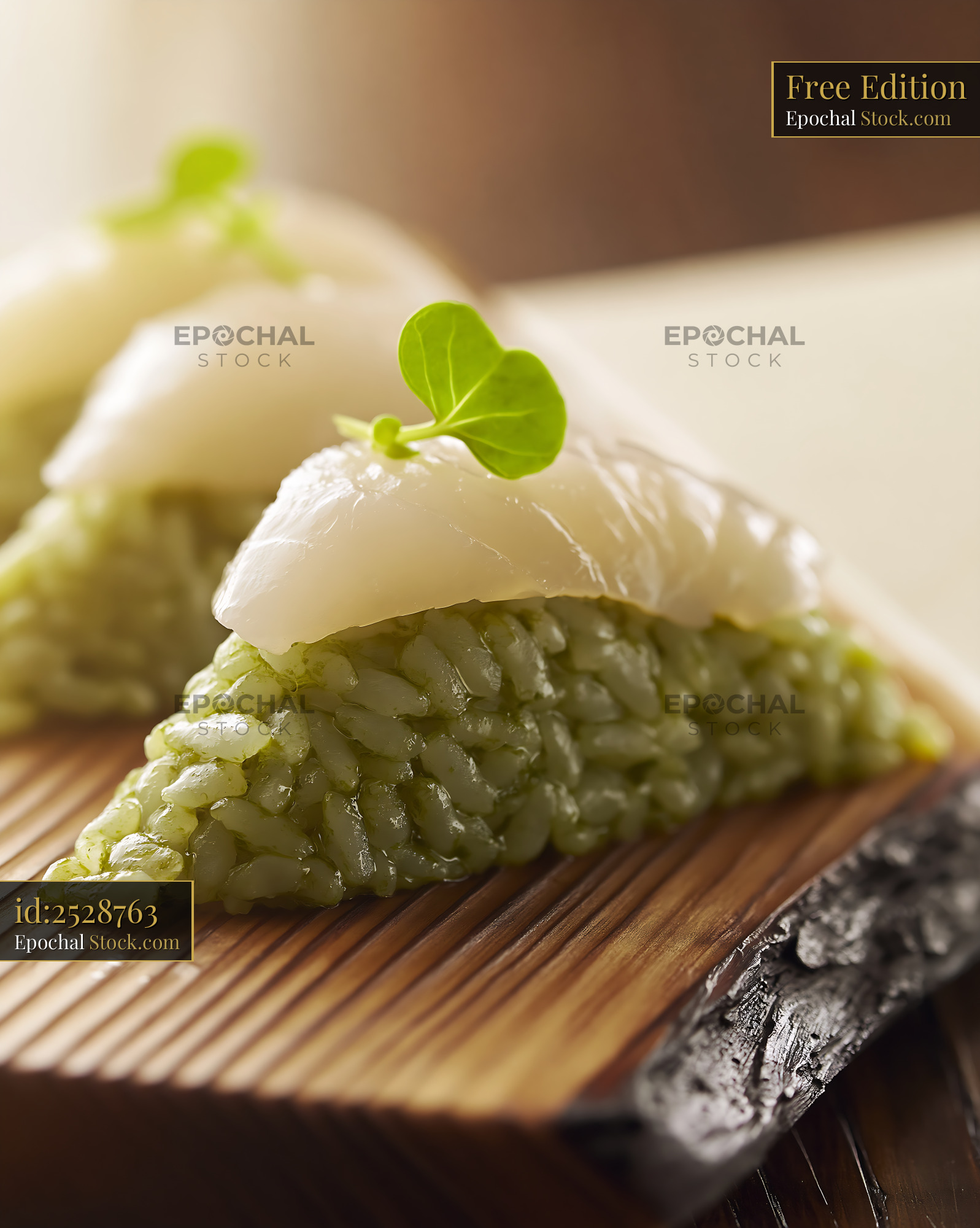 Gourmet matcha infused rice sushi topped with fresh white fish