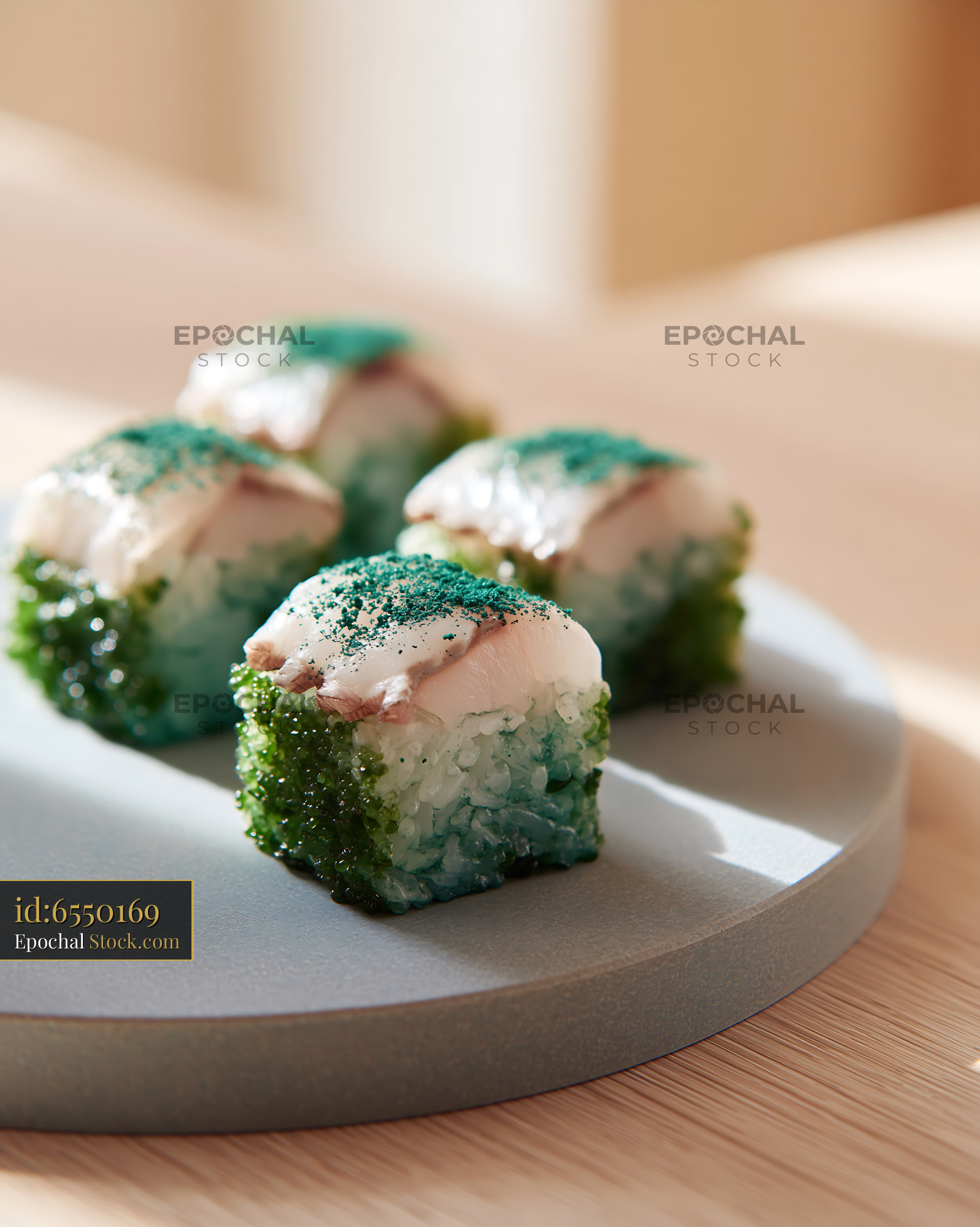 Artistic sushi cubes topped with fresh white fish and vibrant spirulina powder, showcasing a modern take on healthy Japanese fusion cuisine with a minimalist aesthetic.