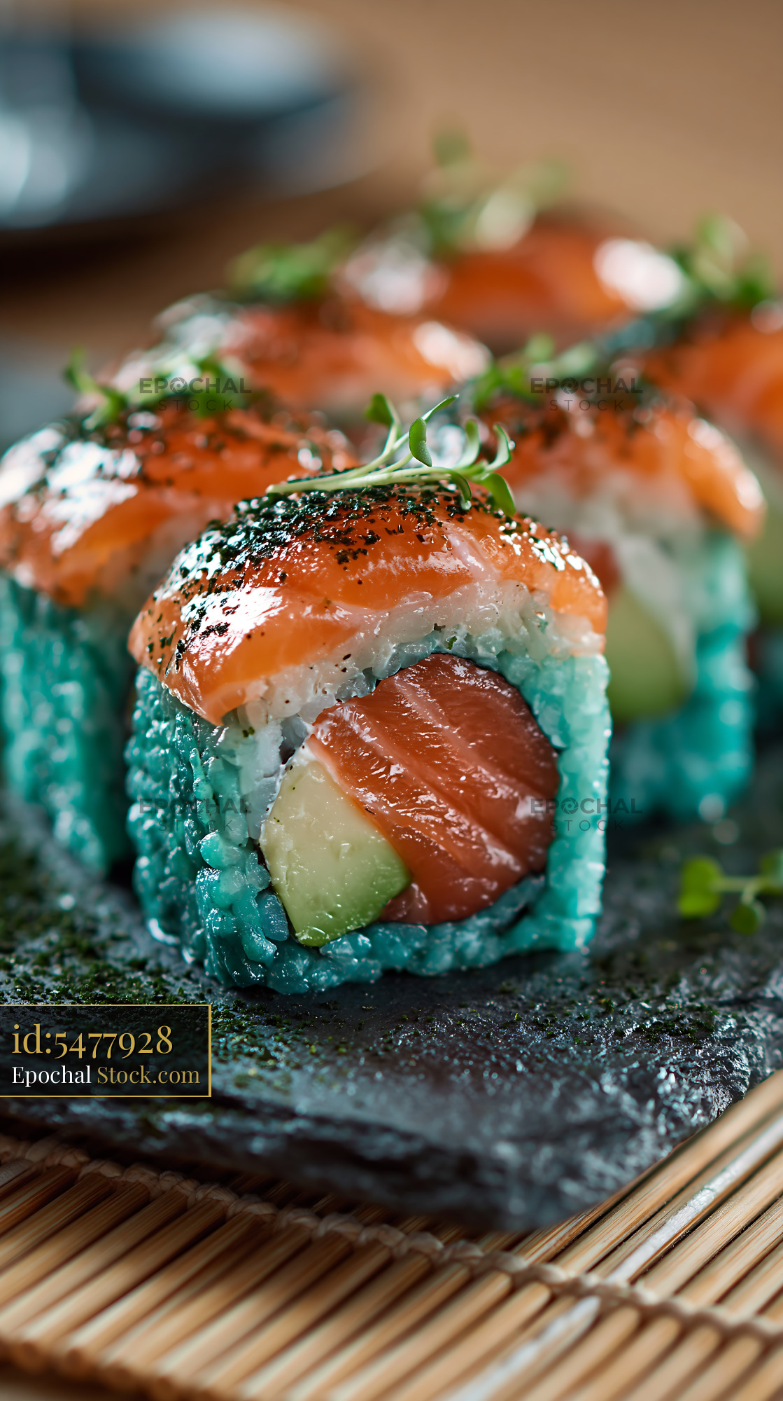 Gourmet sushi rolls with blue spirulina rice salmon and avocado