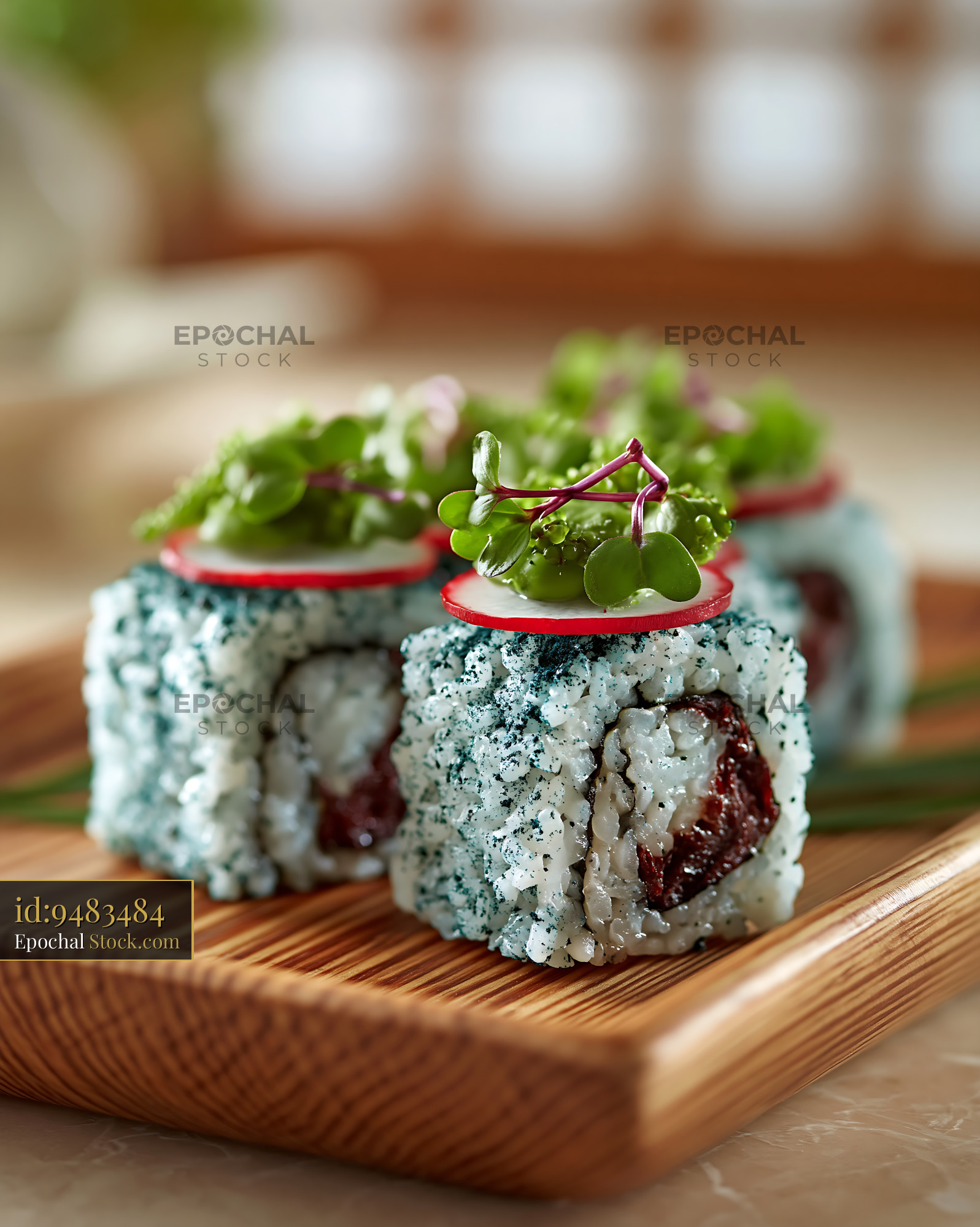 Innovative sushi rolls featuring rice infused with spirulina powder, topped with radish and microgreens, highlighting a fusion of superfoods and modern plant-based Japanese cuisine.