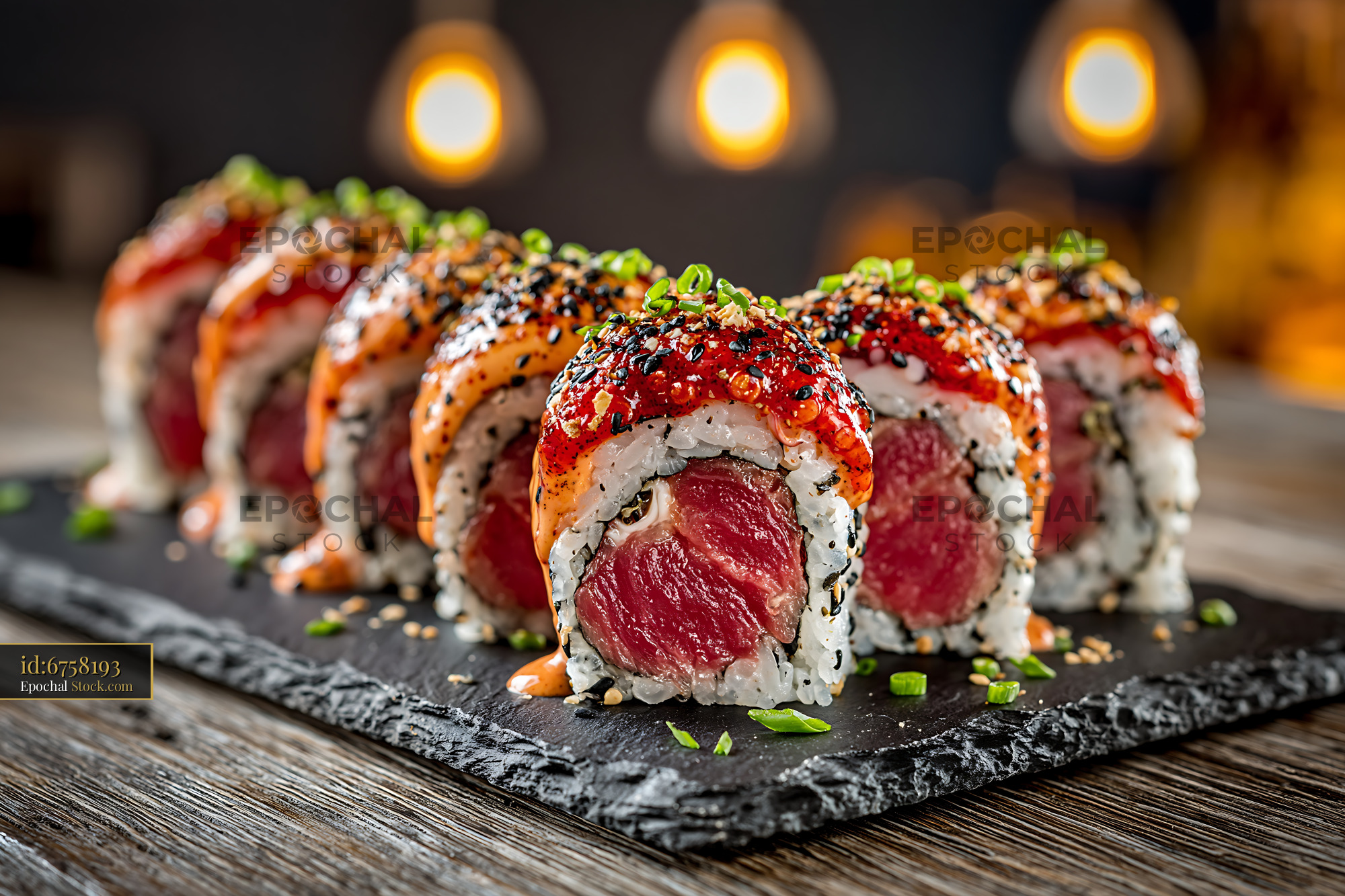 Spicy tuna sushi rolls topped with creamy sriracha mayo and sesame seeds, served on a slate board in a warm restaurant setting, capturing a gourmet Asian fusion dining experience.