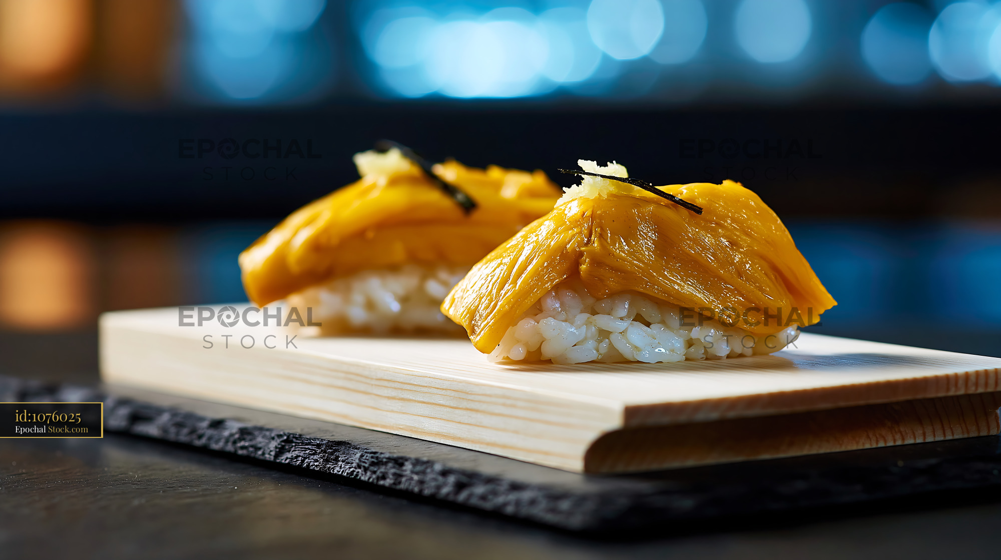Gourmet vegan jackfruit nigiri sushi served on a wooden board