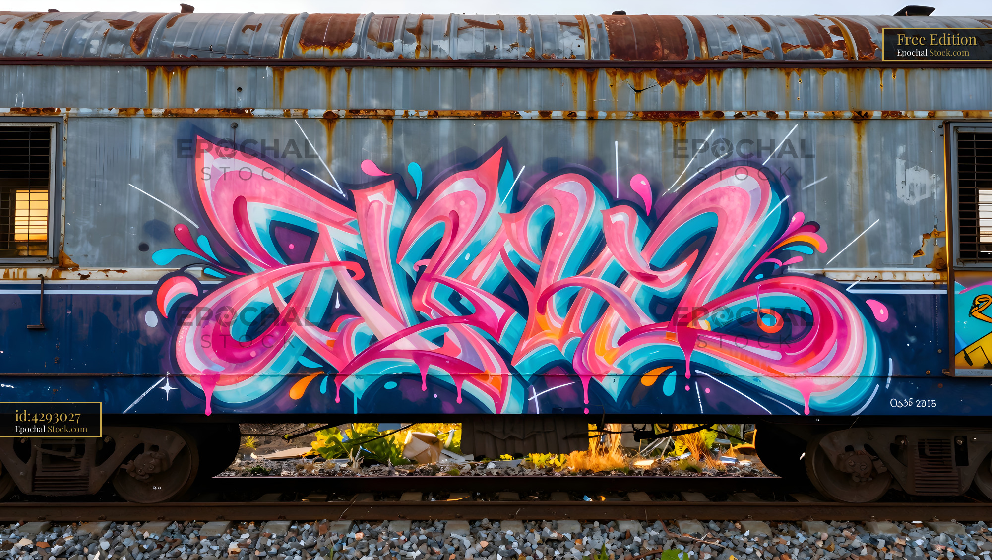 Graffiti art on a train car in an urban area at sunset Free Premium Stock Image