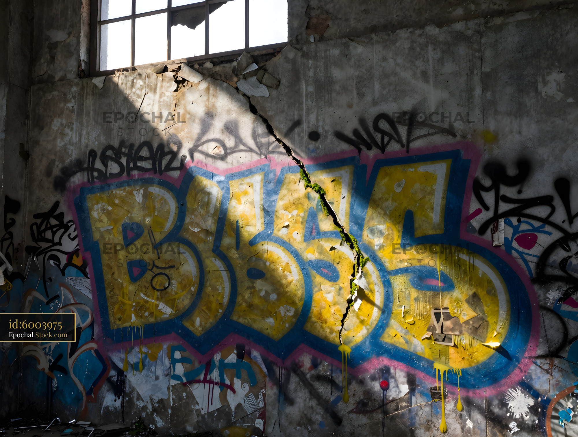 Bright graffiti covers a wall in an old, abandoned building. Sunlight streams through a broken window, highlighting the colors and texture of the paint on the concrete surface.