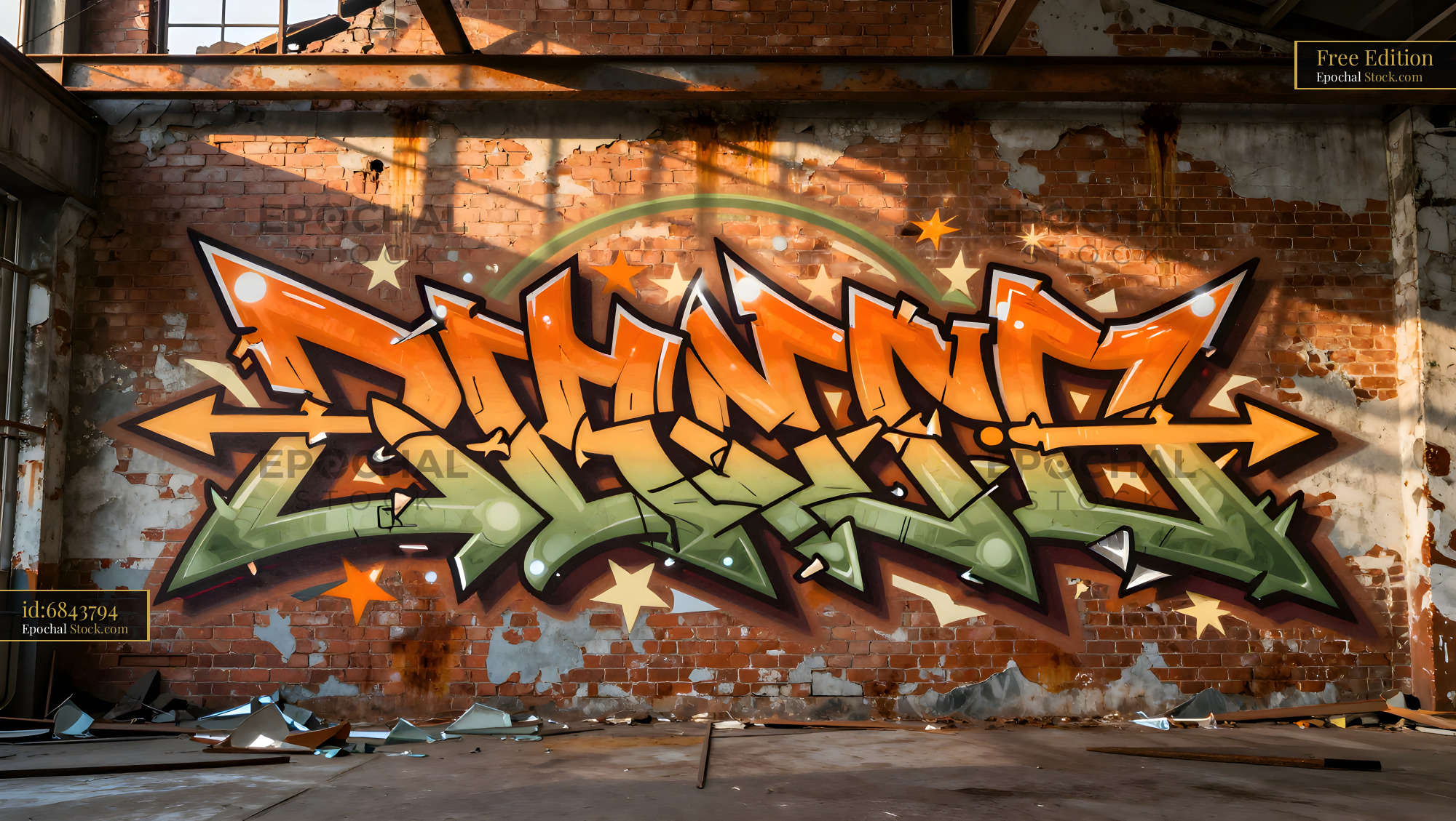 Colorful graffiti covers a brick wall in an old warehouse. Sunlight shines through broken windows, highlighting the bright colors and shapes of the artwork.