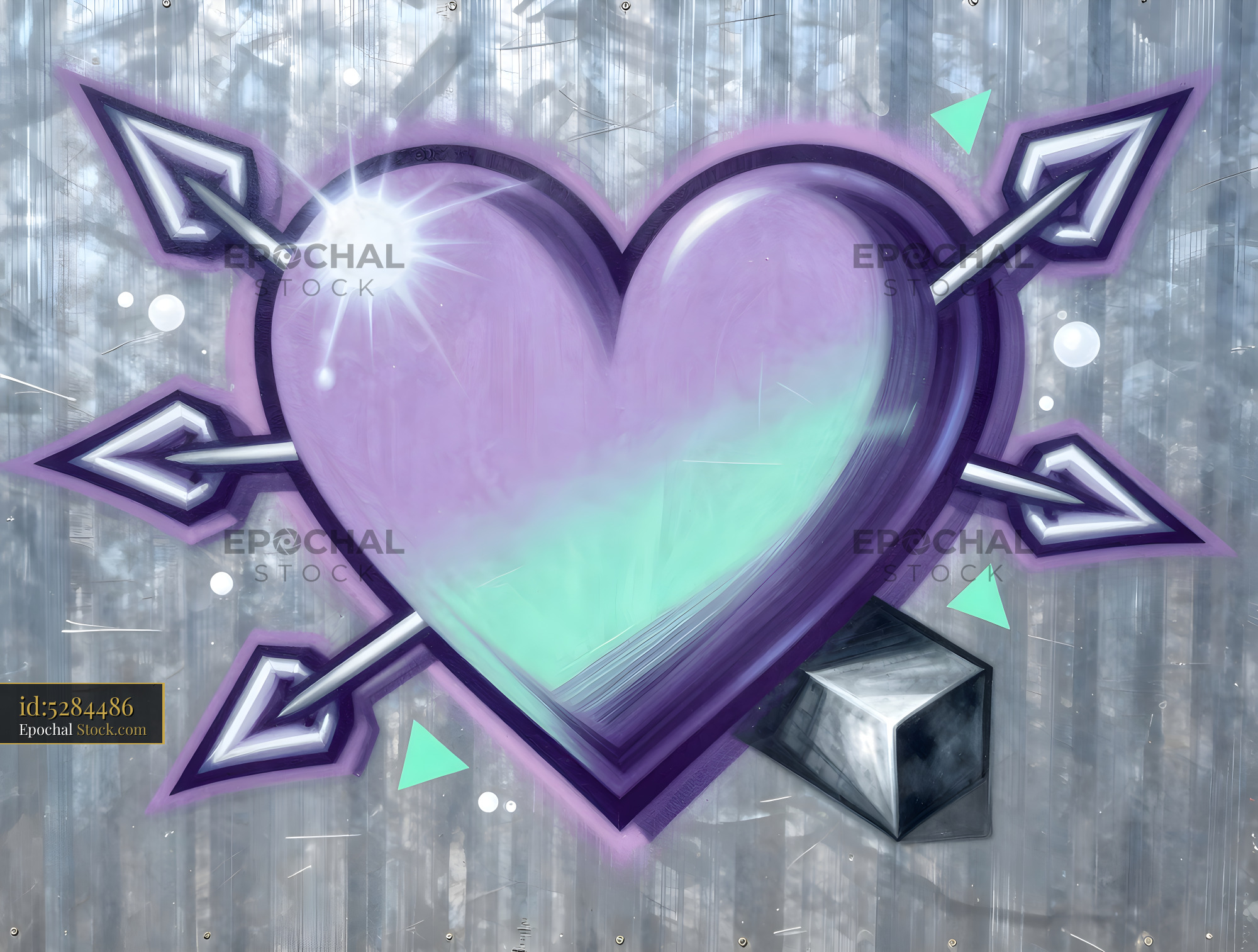 A heart with arrows is spray painted on a silver wall. The heart is purple with a green center. It is surrounded by a cube and shapes. The art features glossy details that catch the light.