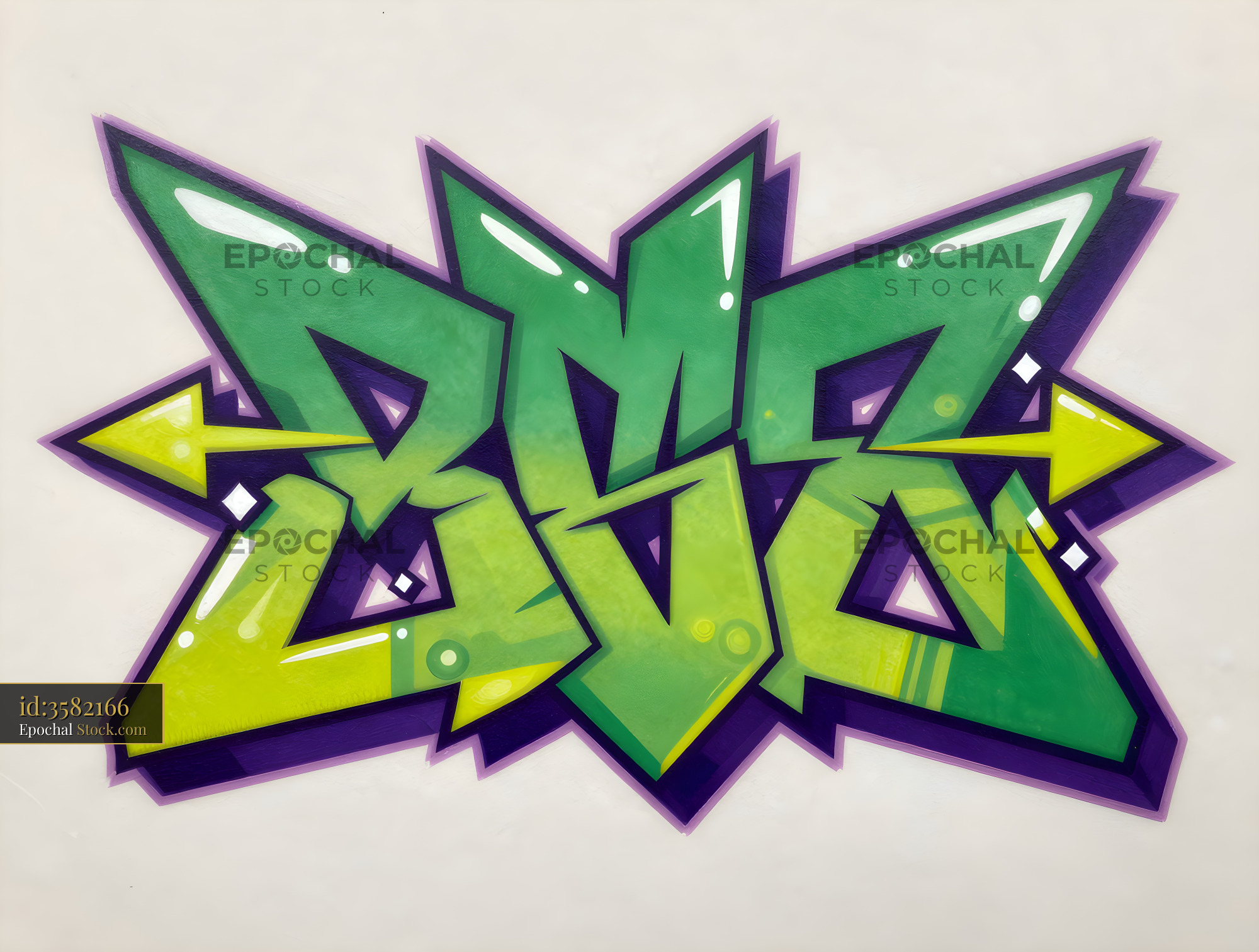 A colorful piece of graffiti shows bold letters and shapes. The design uses green and purple and covers a large space. This art demonstrates street culture and creativity in an urban area.