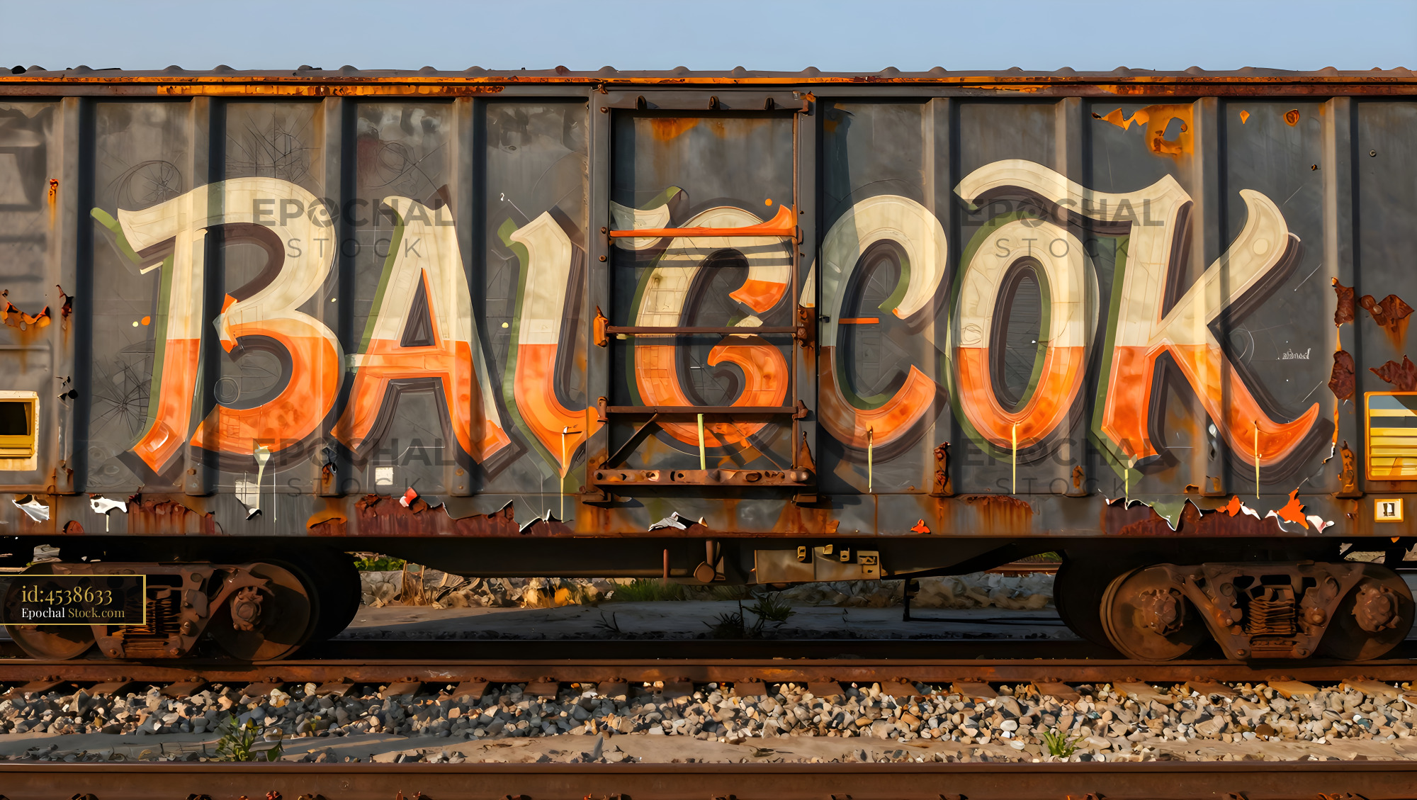 A freight train car stands on the tracks with large graffiti visible on its side. The artwork features bold letters and bright colors. Sunlight shines on the scene, highlighting the details.
