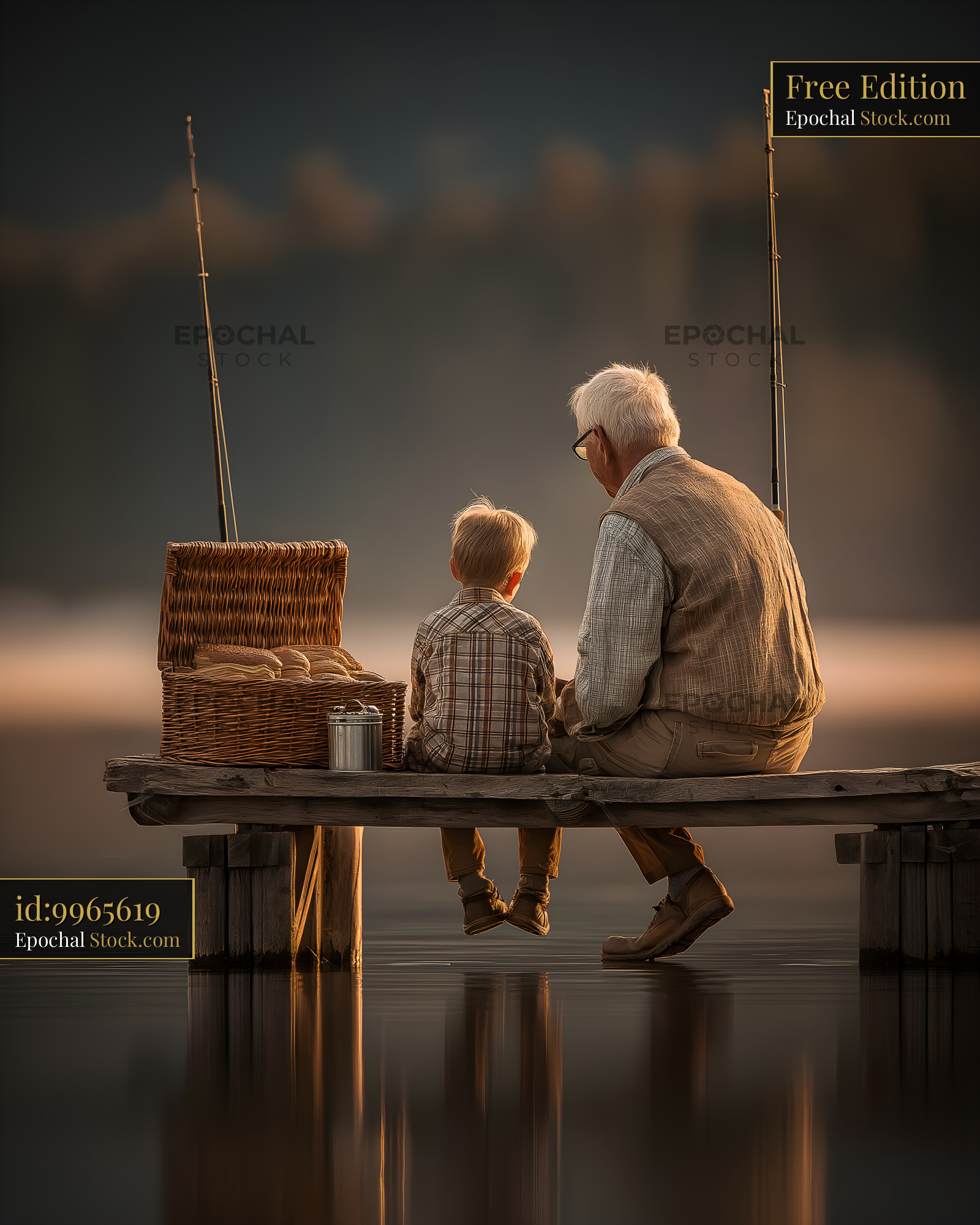 A grandfather and his grandson sit on a wooden dock by a lake. They watch the water and hold fishing rods. A basket sits nearby as they enjoy their time together in the early morning.