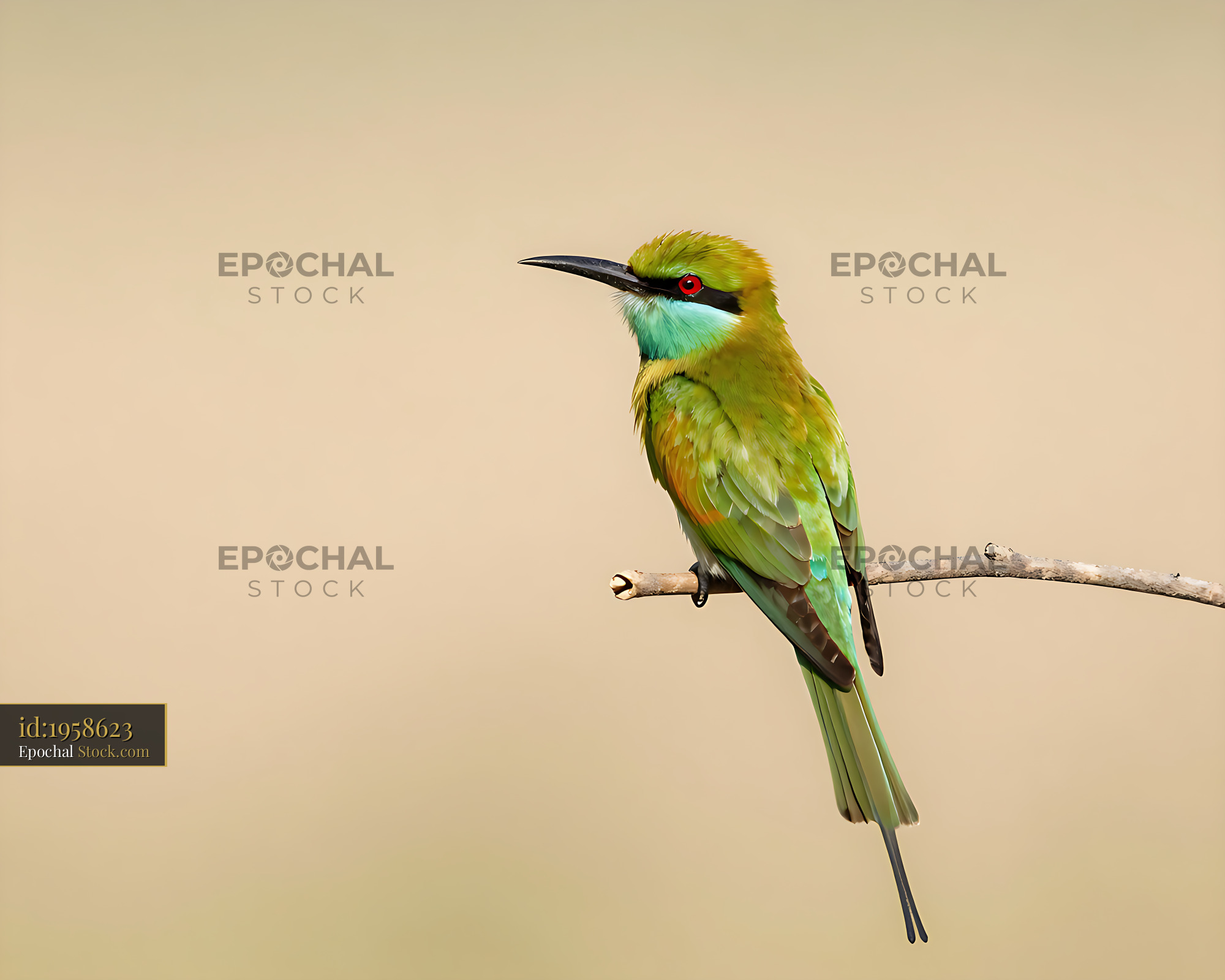 A vibrant green bee-eater with striking red eyes sits calmly on a thin twig against a soft, neutral background, capturing the elegance and precision of wildlife in nature.