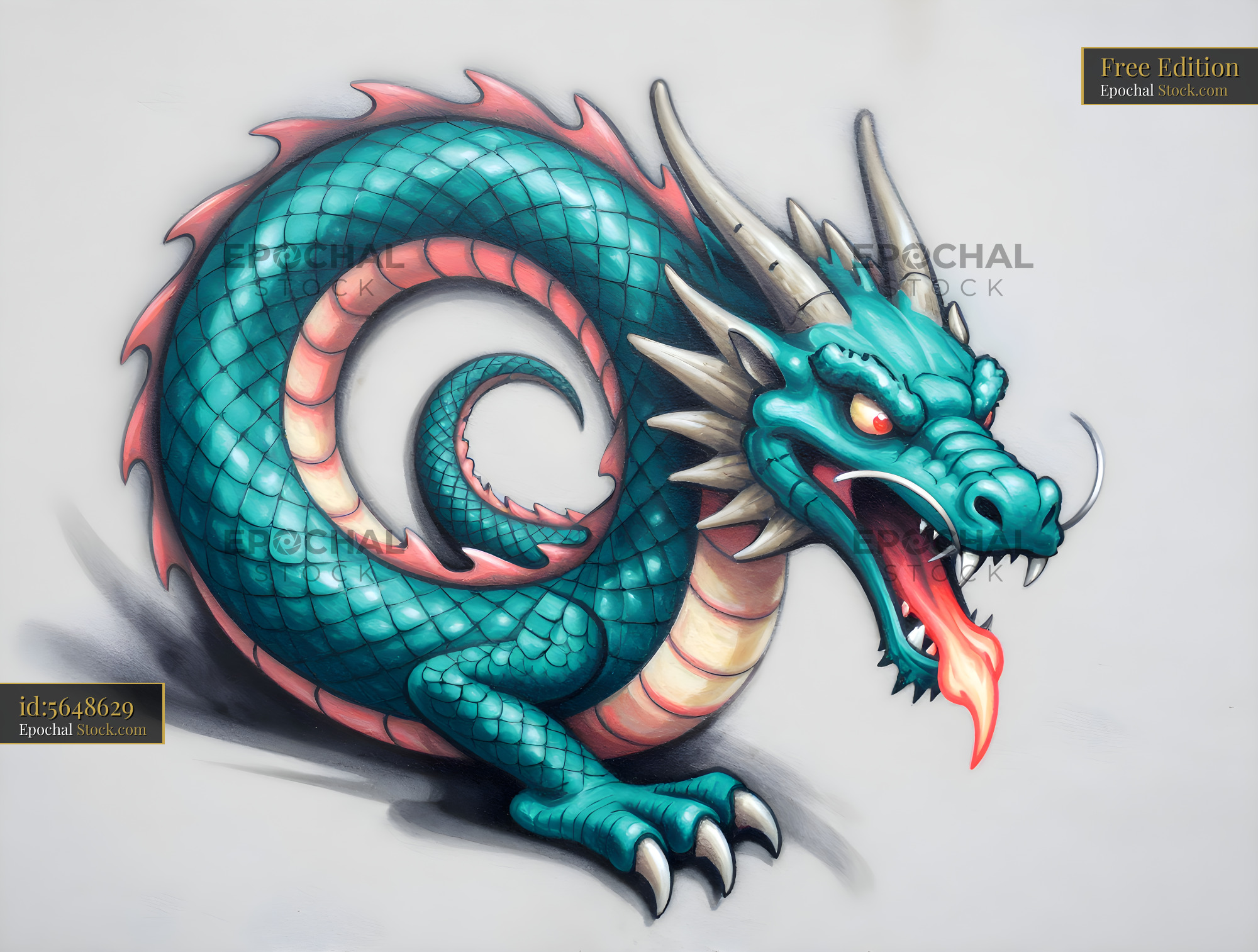 A dragon with teal scales and red accents is coiled on a flat surface. It has sharp claws, spiky horns, and flames coming from its mouth, showing detailed artistic work.