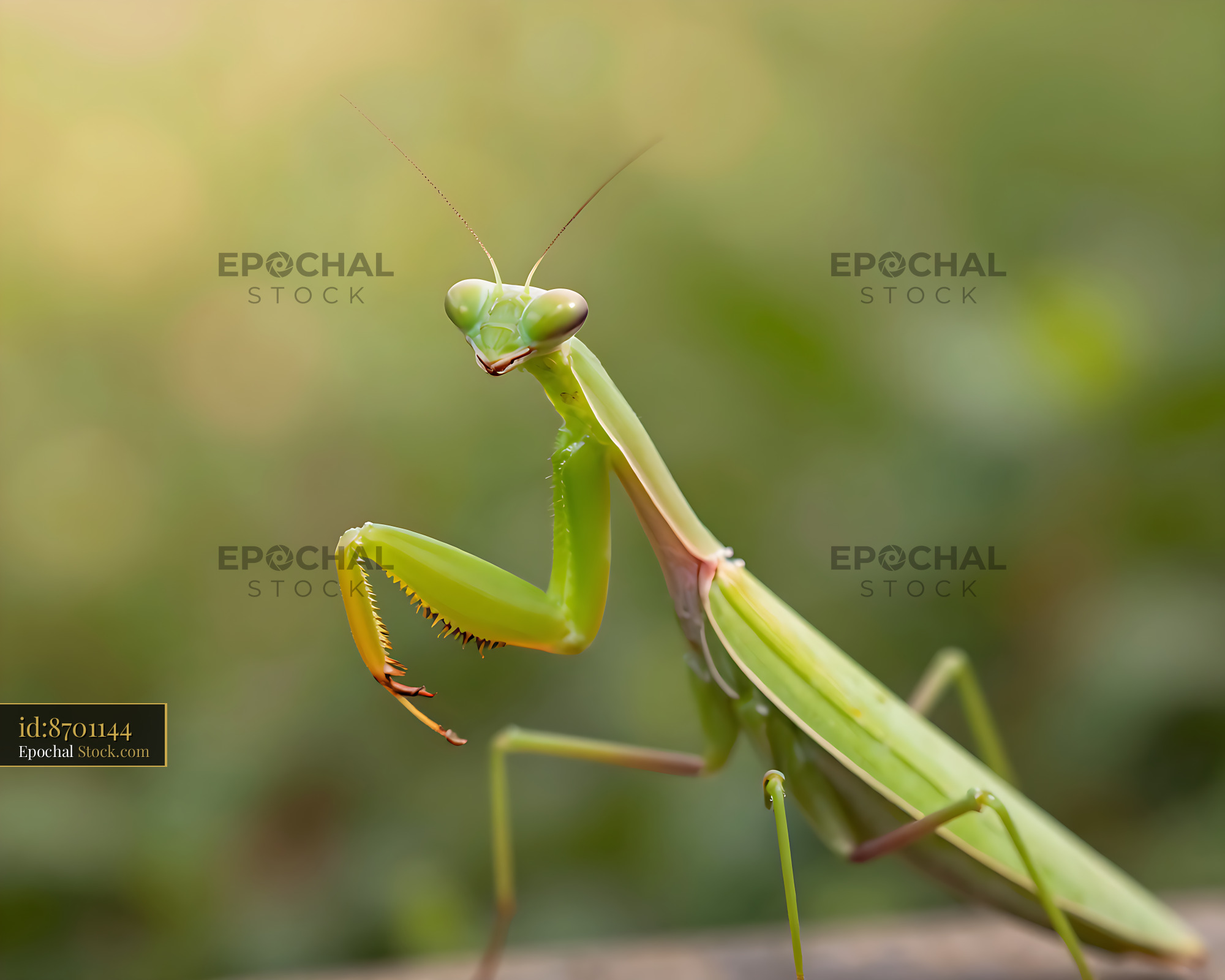 A vibrant green praying mantis strikes a curious pose against a soft bokeh background, capturing the elegance and predatory stillness of nature in soft morning light.