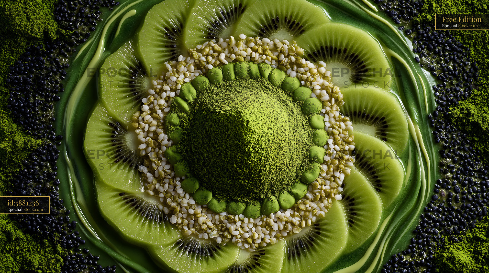 A green smoothie bowl is placed on a surface. The bowl is decorated with kiwi slices and matcha powder. This dish is bright and colorful, perfect for breakfast or a healthy snack.