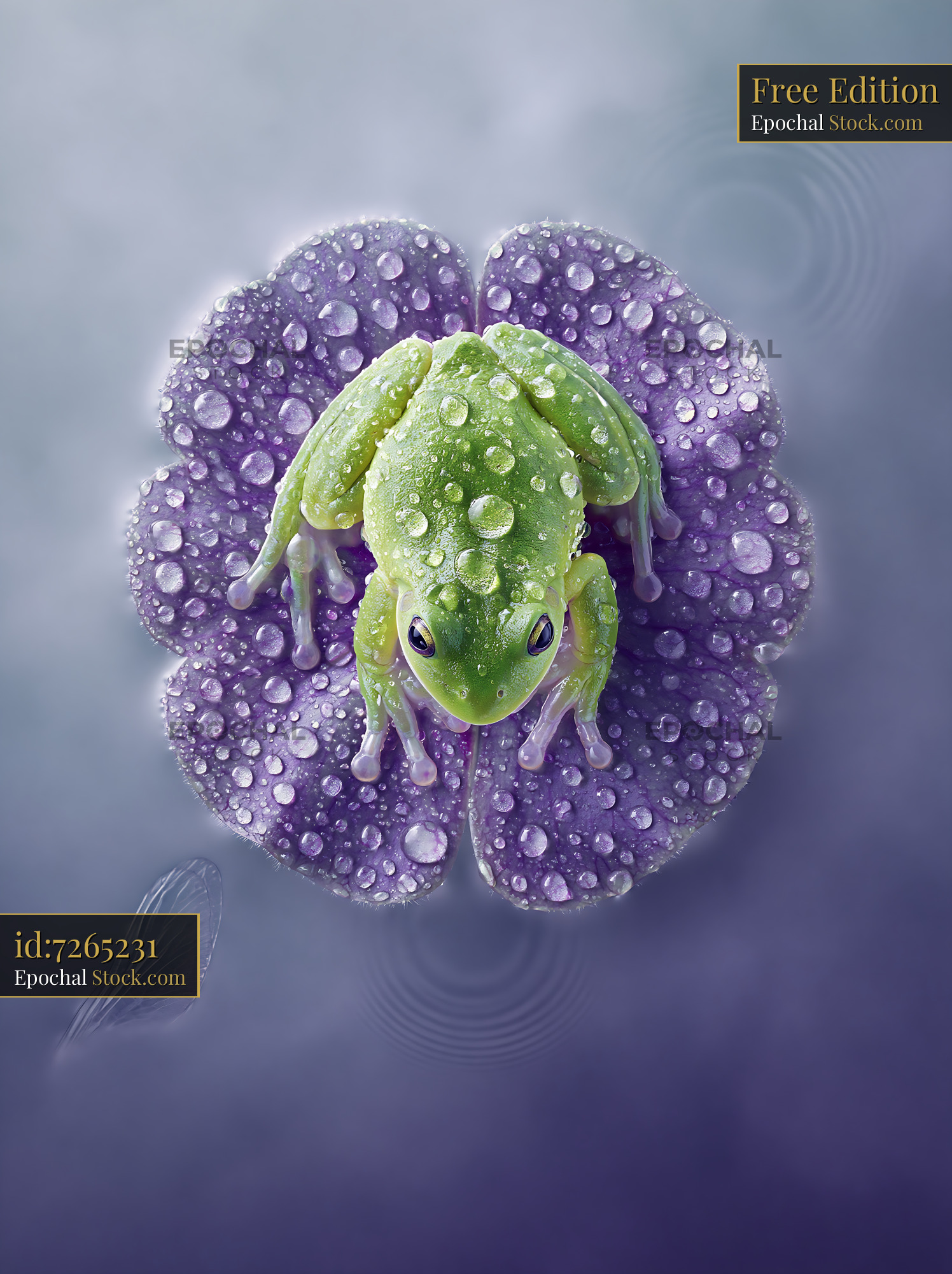 A vibrant green tree frog rests on a purple flower petal adorned with glistening water droplets, capturing the serene and refreshing essence of a rainy day in nature.