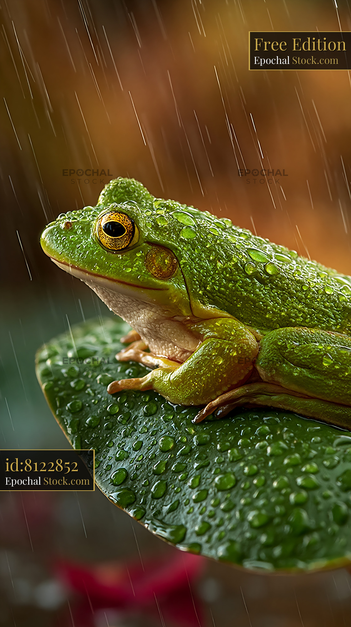 A vibrant green tree frog rests calmly on a wet leaf during a rain shower, surrounded by golden light and sparkling water droplets, capturing a moment of serenity and resilience in nature.