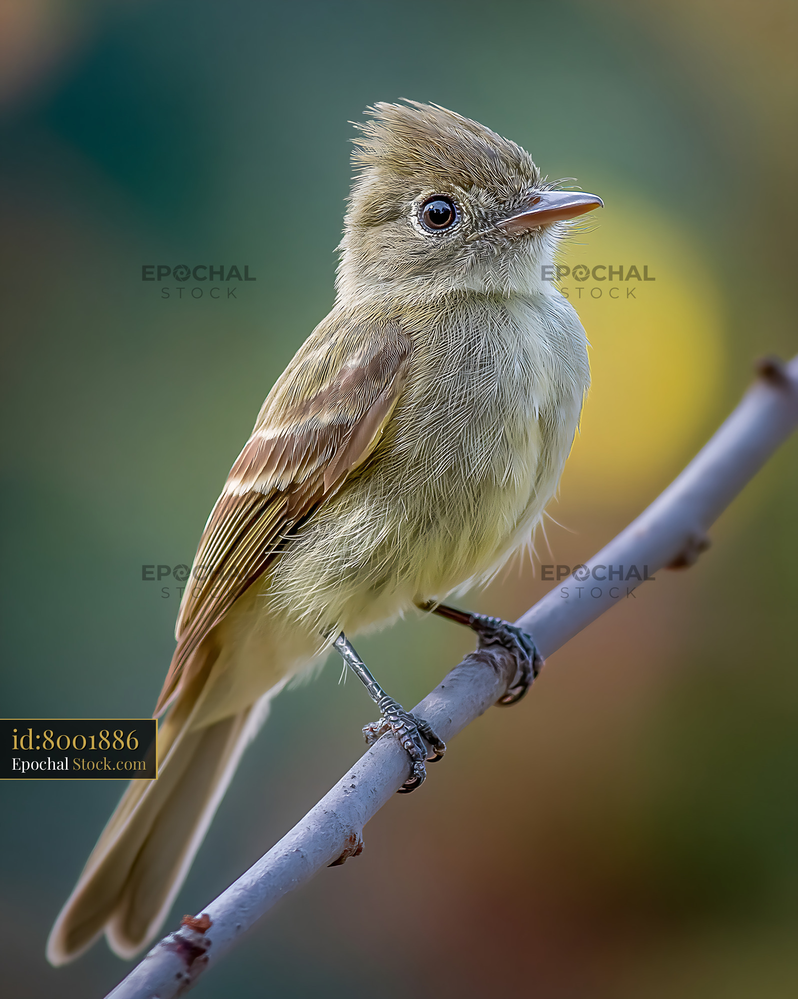 A small greenish elaenia sits alertly on a thin branch, showcasing its delicate feathers and crest against a soft, colorful bokeh background of a tropical forest.