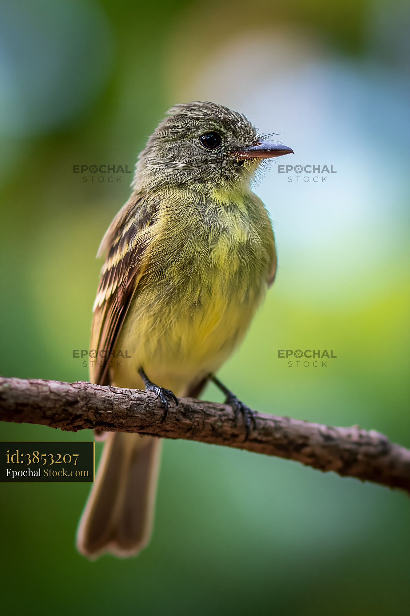 A small greenish elaenia bird perches alertly on a weathered branch against a soft green background, capturing a moment of quiet nature and wildlife beauty.