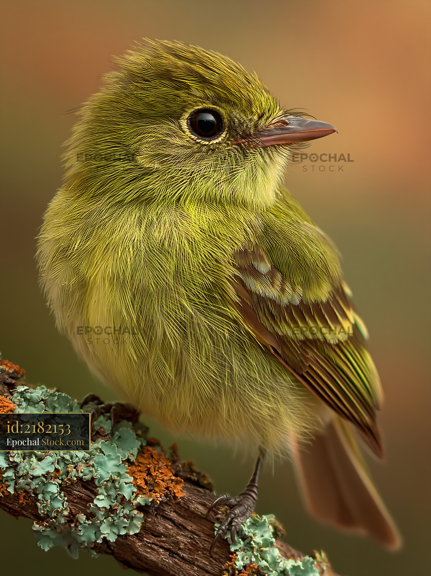 A small greenish elaenia bird sits alert on a weathered branch adorned with soft green and orange lichen, captured in profile against a warm, blurred golden backdrop. The intimate portrait emphasizes the delicate details of the bird's plumage and expressive eye, conveying a sense of natural wonder and peaceful observation.