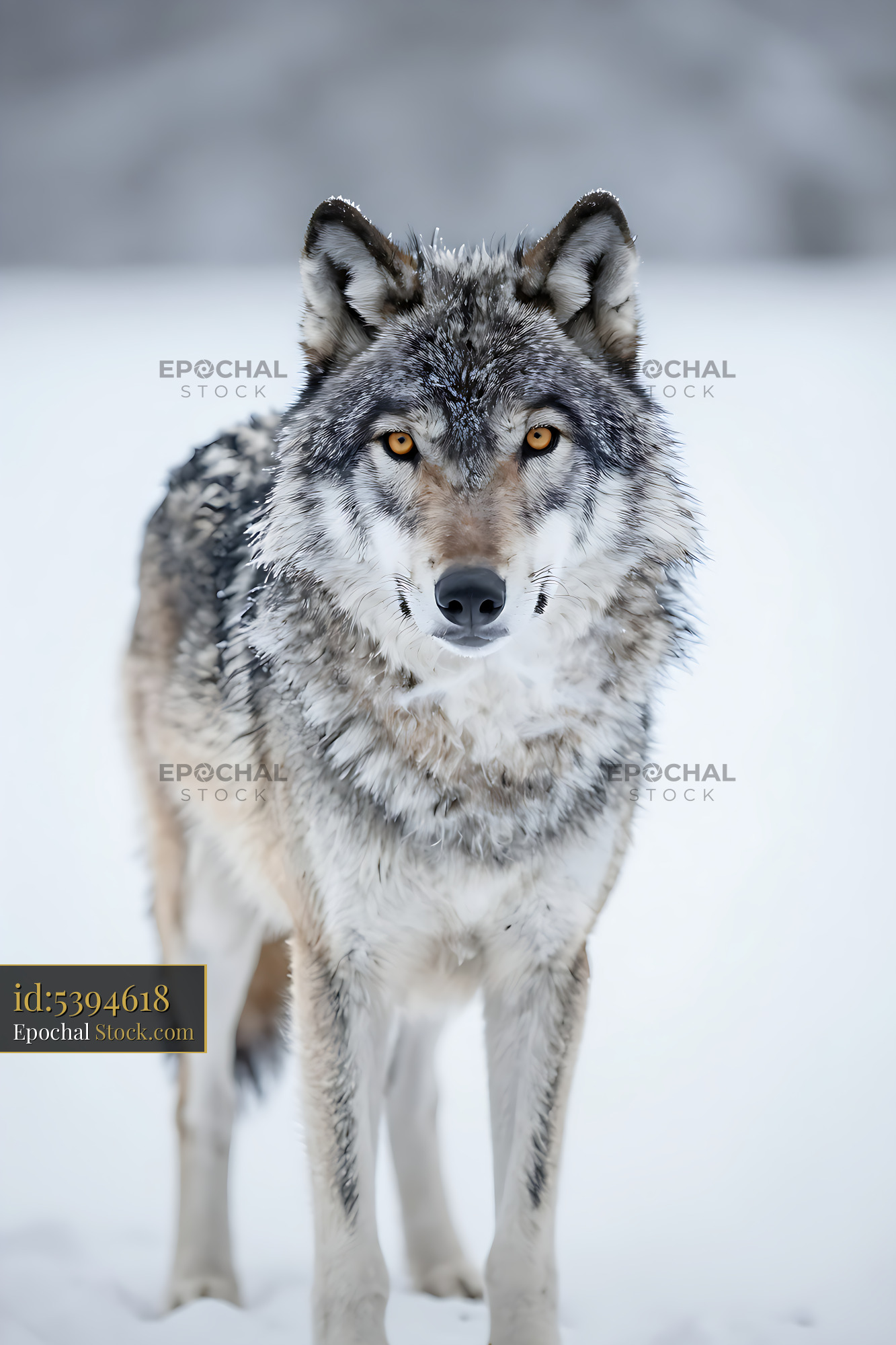 A majestic grey wolf stares intensely into the camera while standing in a snowy landscape, capturing the essence of wild nature, solitude, and the raw beauty of winter.