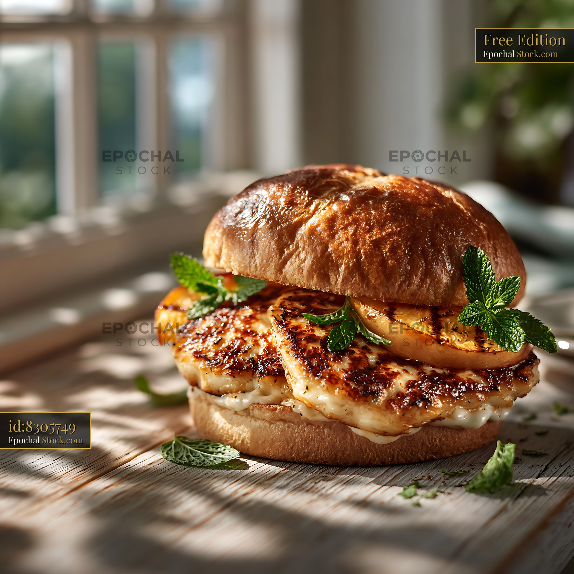 A delicious vegetarian halloumi burger featuring grilled cheese, caramelized peach slices, and fresh mint leaves, set in a warm, sunlit kitchen atmosphere.