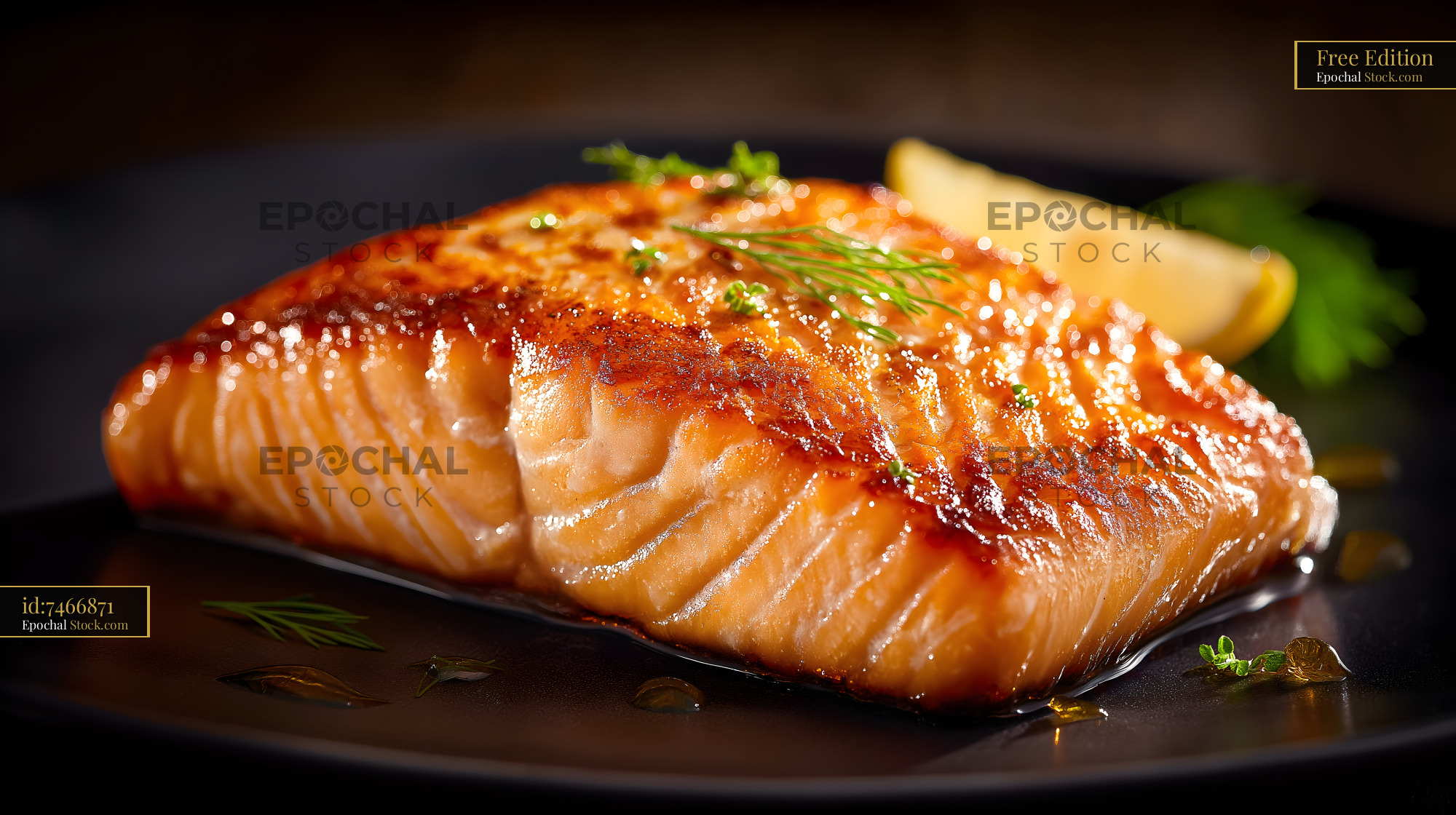 A grilled salmon fillet sits on a black plate. The fish is cooked to a golden brown color. A lemon wedge and fresh herbs are placed on the side for flavor.
