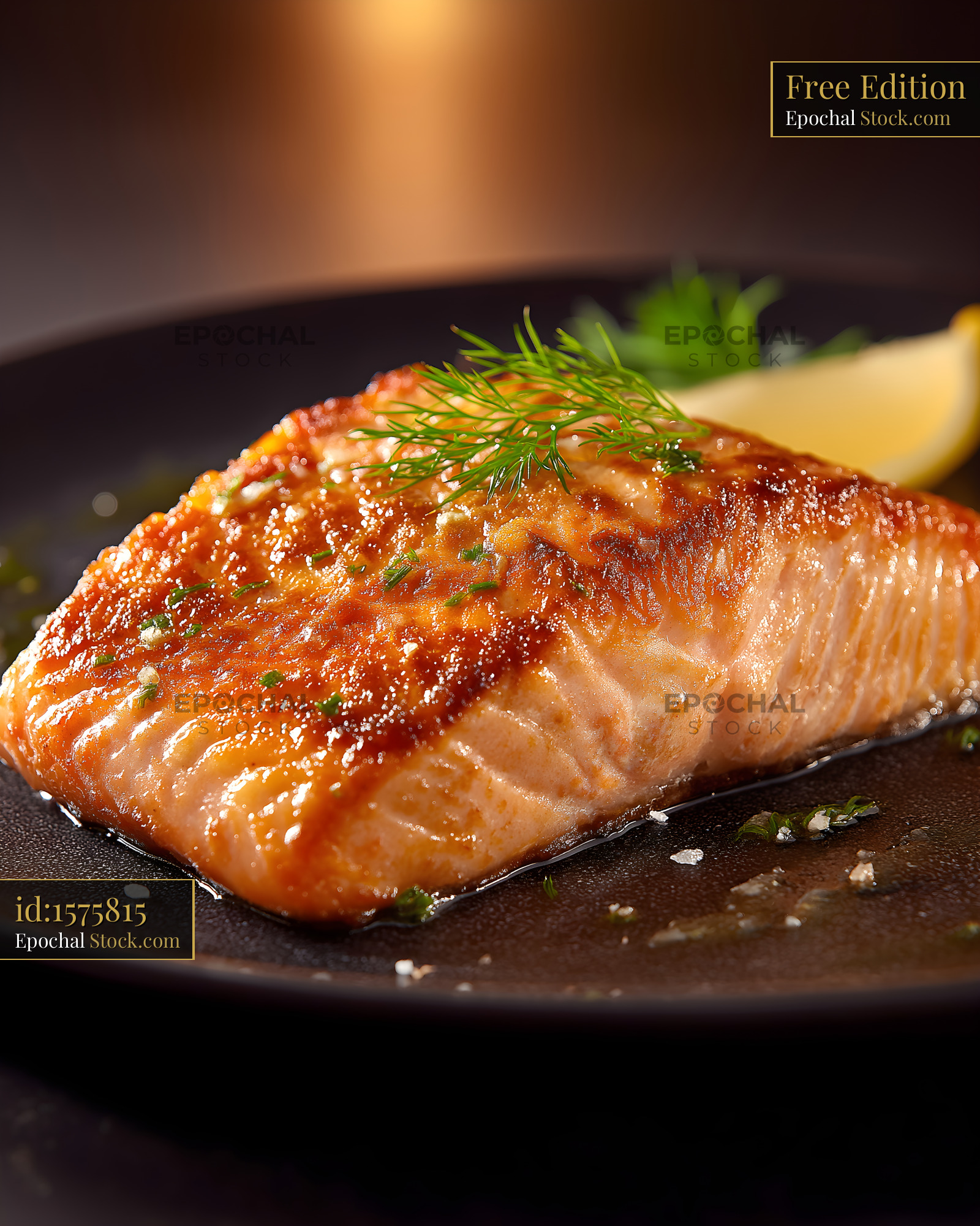 A piece of grilled salmon is placed on a black plate. The fish has a golden crust and is garnished with fresh herbs. A lemon slice is alongside the salmon.