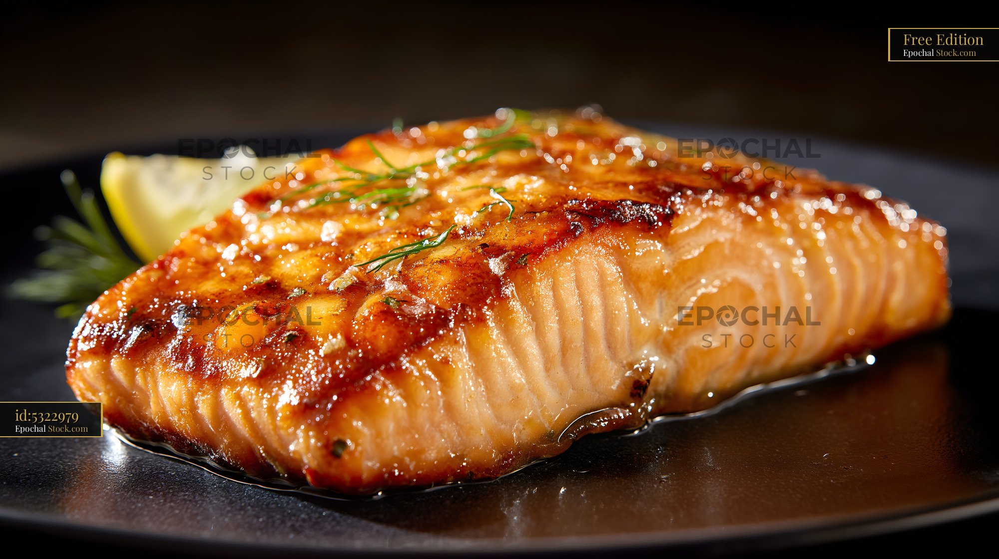 Grilled salmon served with lemon on black plate at a restaurant Free Premium Stock Image