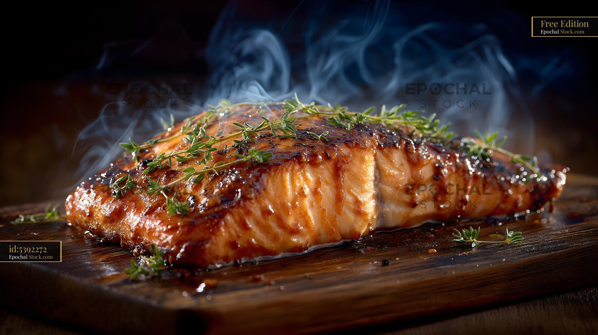 Grilled salmon with herbs on a wooden board in kitchen Free Premium Stock Image