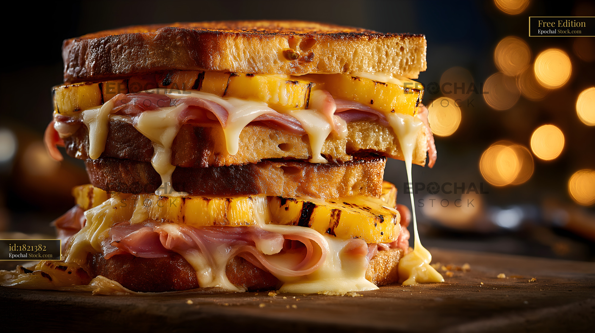 A grilled sandwich stacked high with layers of ham, cheese, and grilled pineapple sits on a wooden board. Soft cheese pulls apart as the sandwich is cut. Warm lights sparkle in the background.