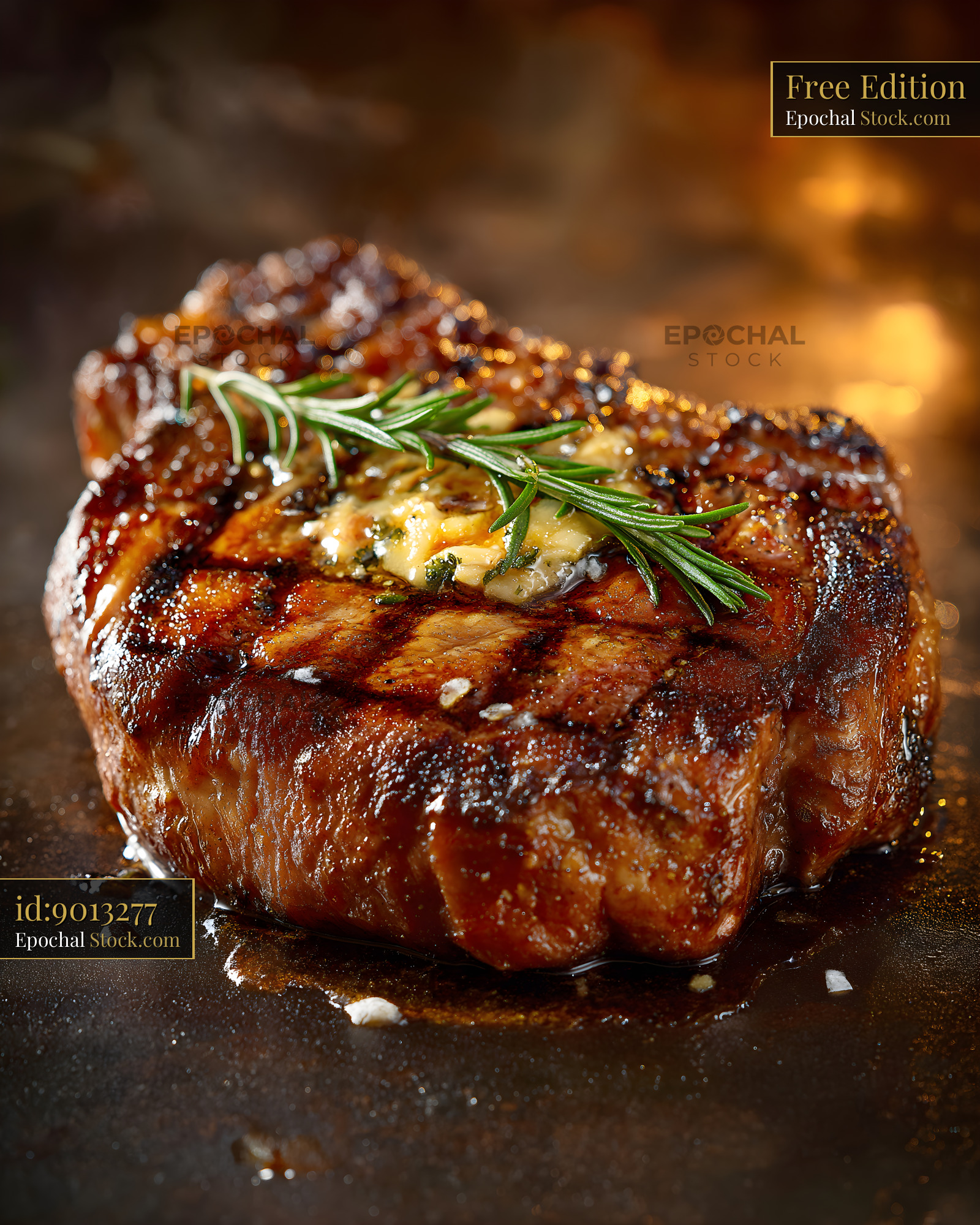 A grilled steak sits on a dark surface. The meat is cooked and has grill marks. A sprig of rosemary rests on top. Butter melts into the steak, creating a shiny texture.