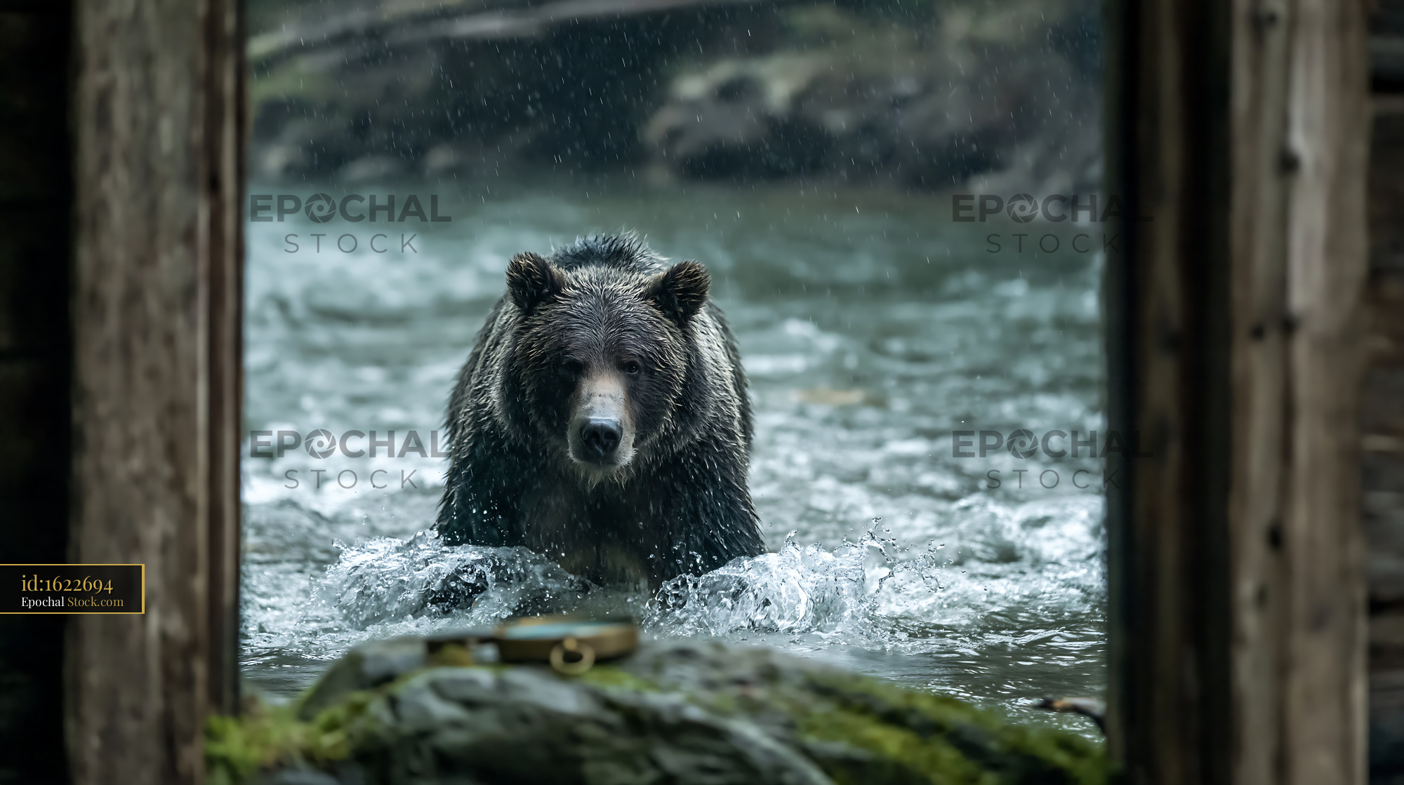 A powerful grizzly bear moves through a splashing river during a rainstorm, framed by a wooden structure, evoking a sense of raw nature and a close wildlife encounter.