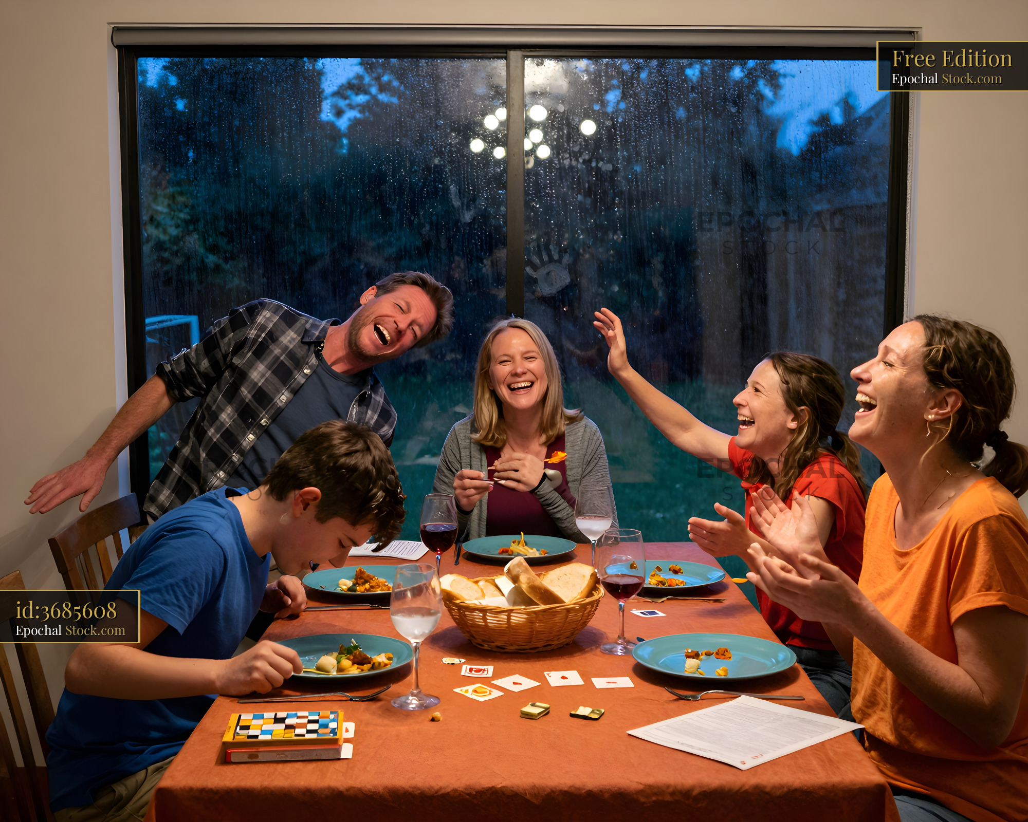 Group enjoys dinner and games in cozy home setting Free Premium Stock Image