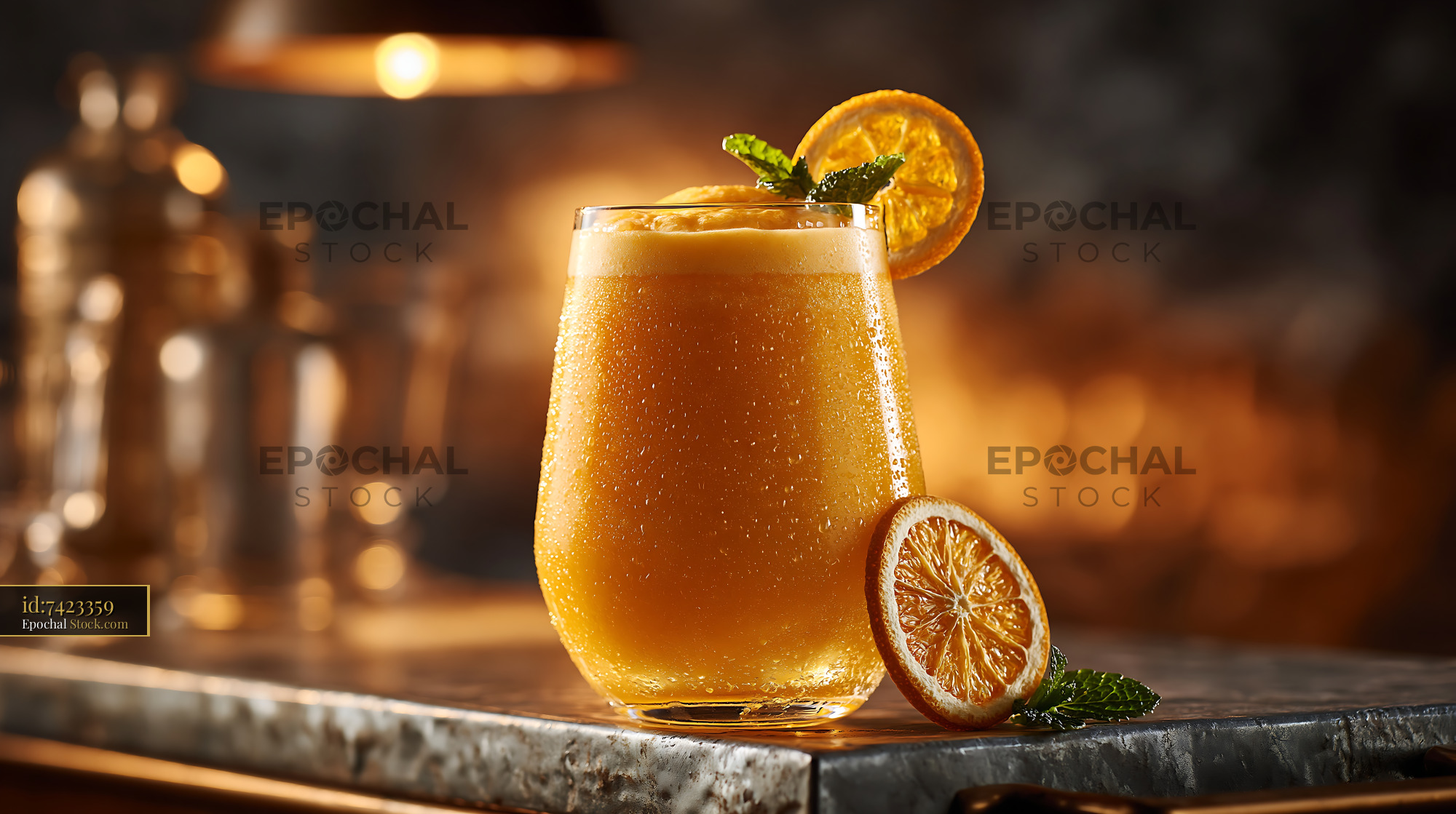 A refreshing hallabong citrus smoothie garnished with mint and dried orange sits on a stone counter, capturing a cozy bar atmosphere with warm bokeh lighting.