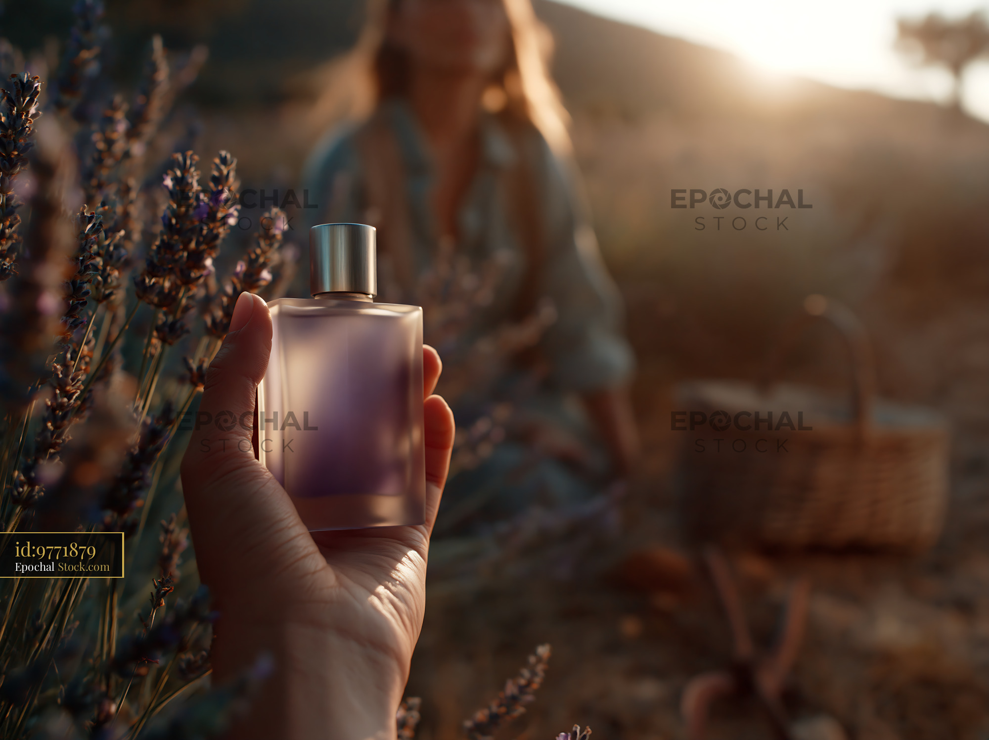 A hand holds an elegant purple perfume bottle in a sun-drenched lavender field, capturing the essence of natural fragrance and the serenity of a summer harvest at golden hour.