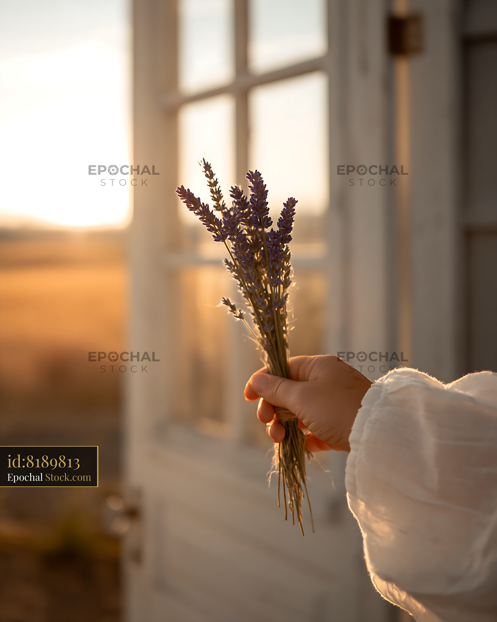 A hand holding a fresh lavender bouquet by an open white door, bathed in the warm light of a golden sunset, conveying a peaceful rustic lifestyle and cottagecore aesthetic.
