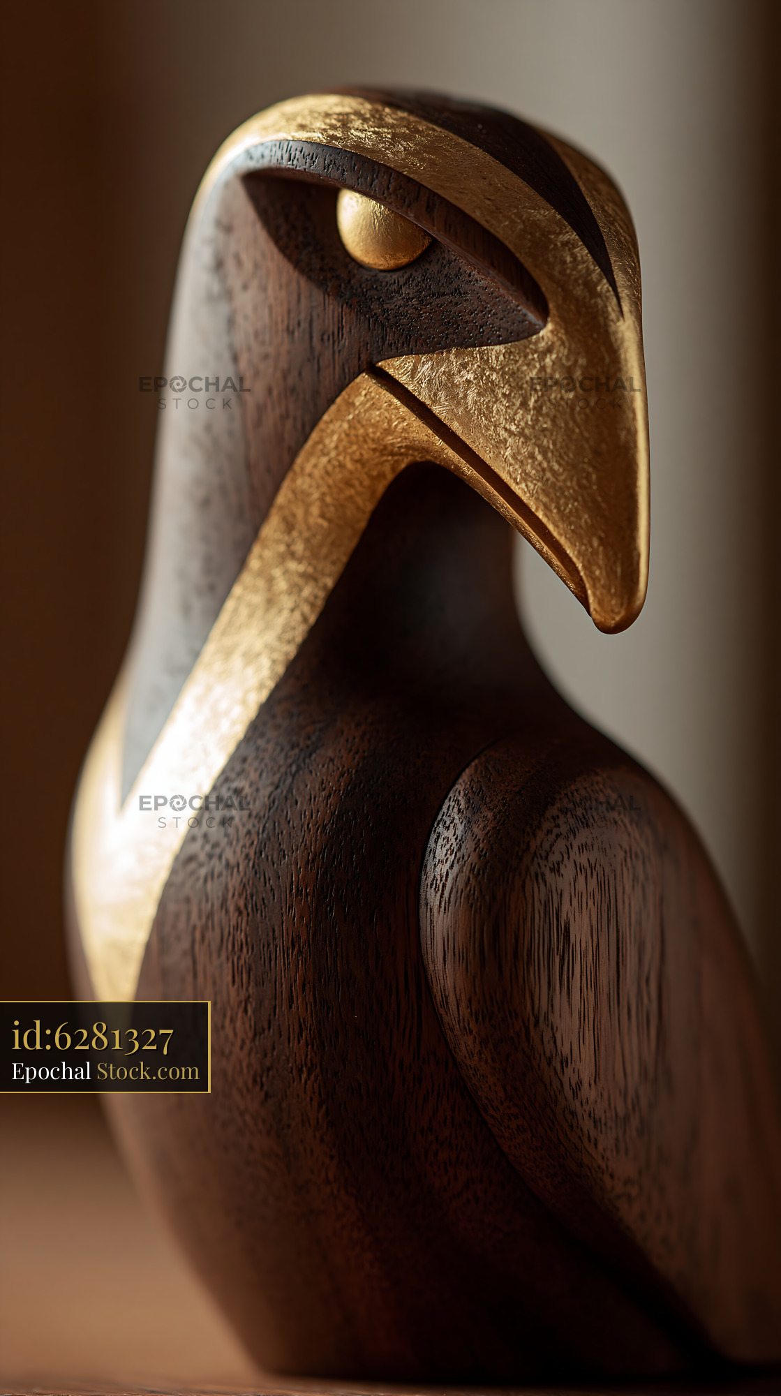 A minimalist wooden bird figurine carved from dark wood and accented with gold leaf, representing elegance, craftsmanship, and artisanal art.