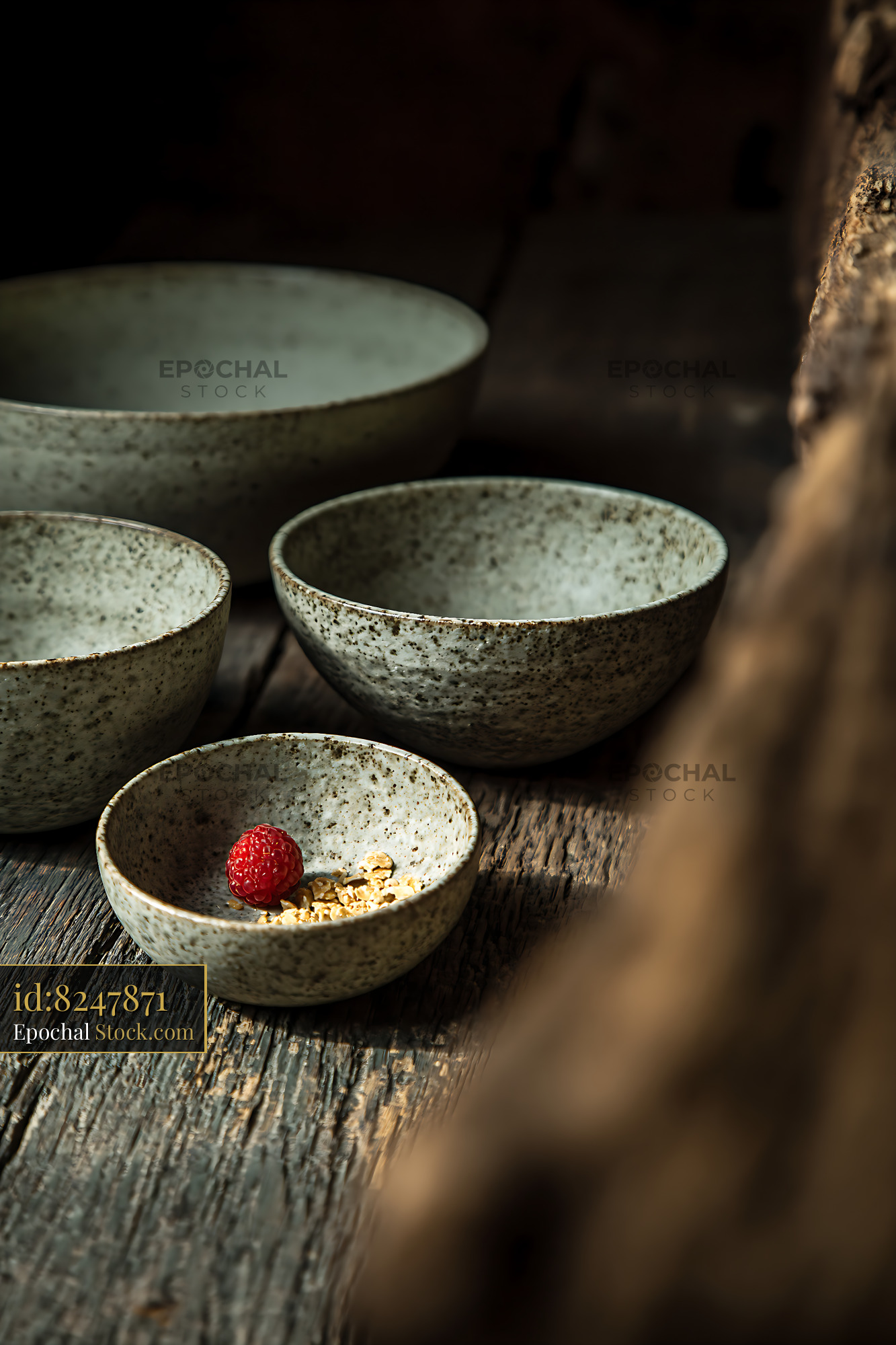 Artisanal stoneware bowls on a weathered wooden surface, featuring a single raspberry and granola to evoke themes of mindful eating, slow living, and rustic craftsmanship.