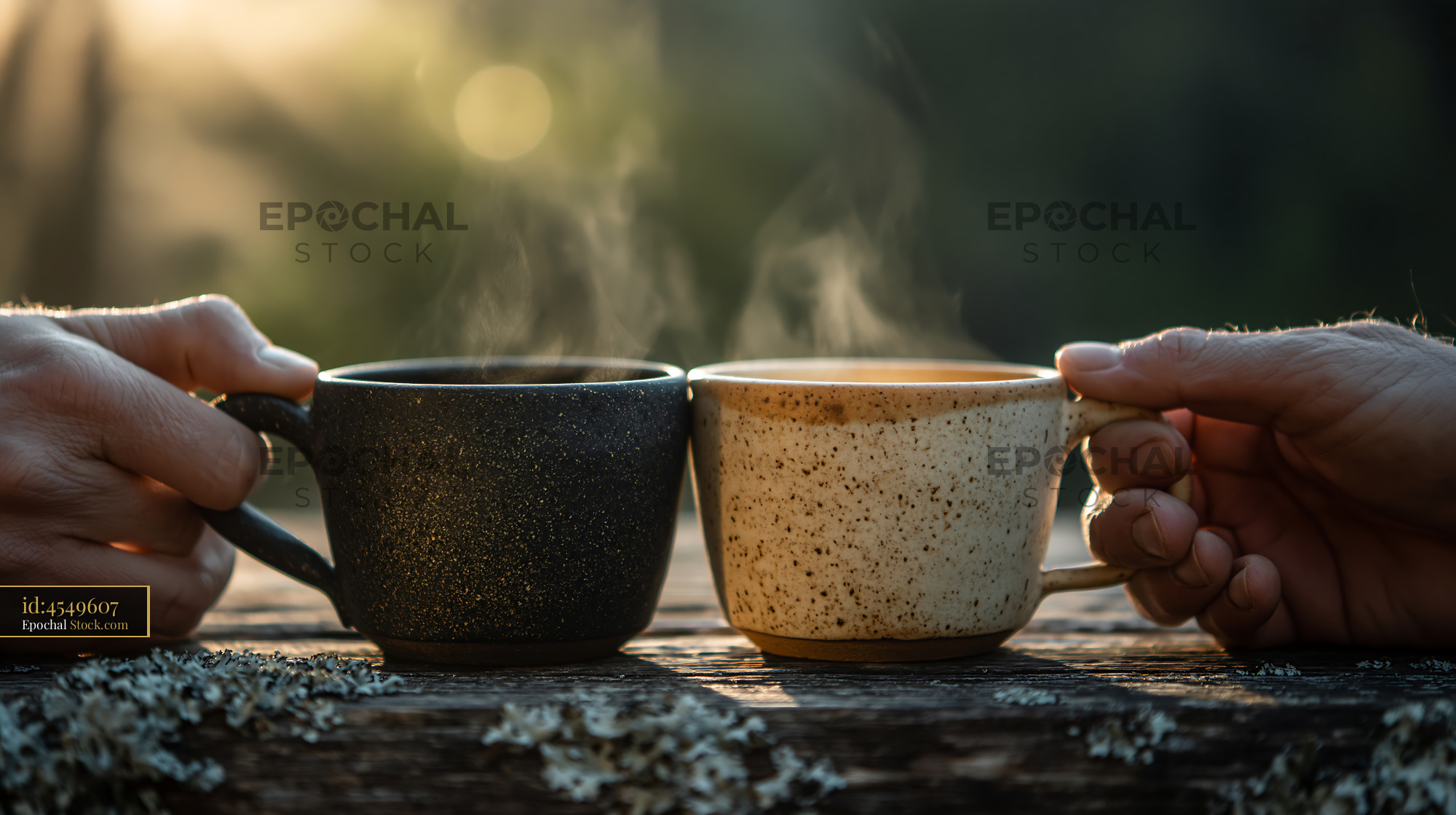 Close up of two hands holding ceramic cups with rising steam on a rustic wooden surface during golden hour, evoking themes of connection, warmth, and a peaceful morning in nature.