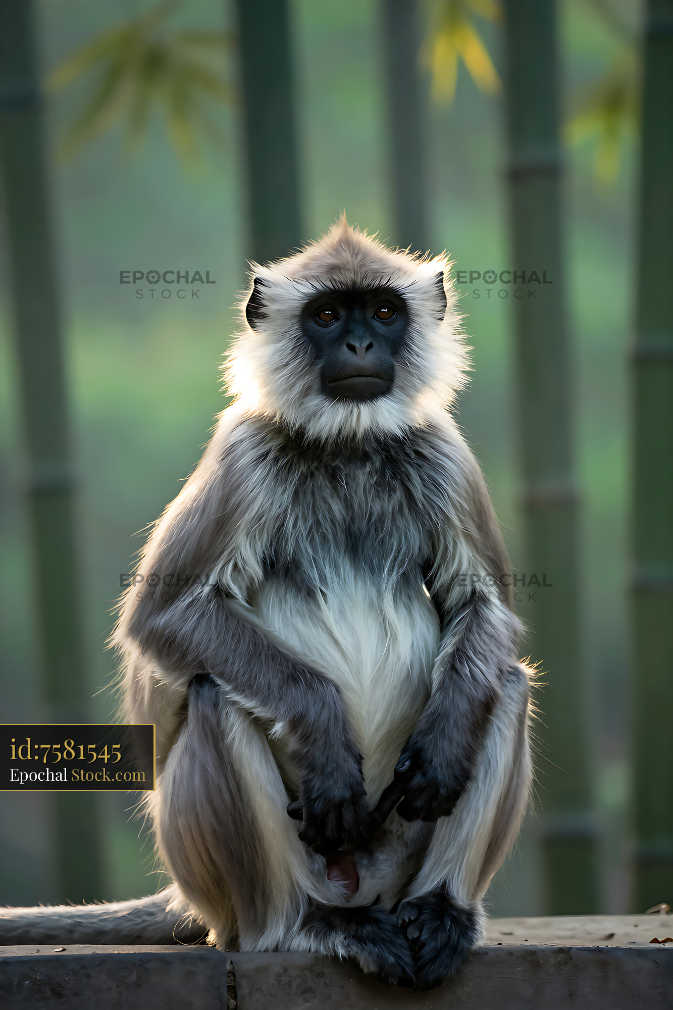 Hanuman langur sitting in a bamboo forest with golden rim light