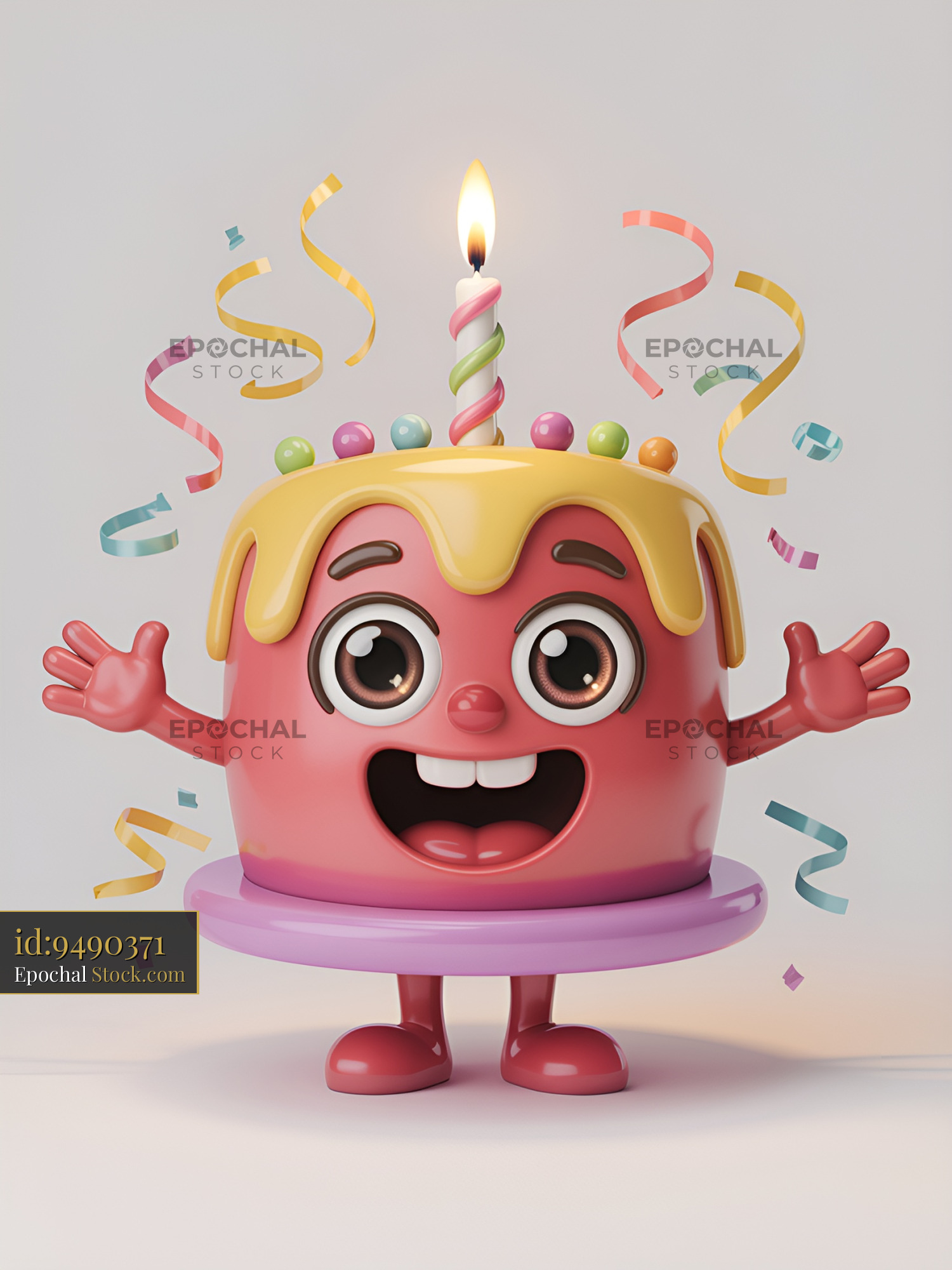 A birthday cake character stands with open arms. It has a big smile and a lit candle on top. Colorful decorations like confetti are around. This scene shows a festive atmosphere.