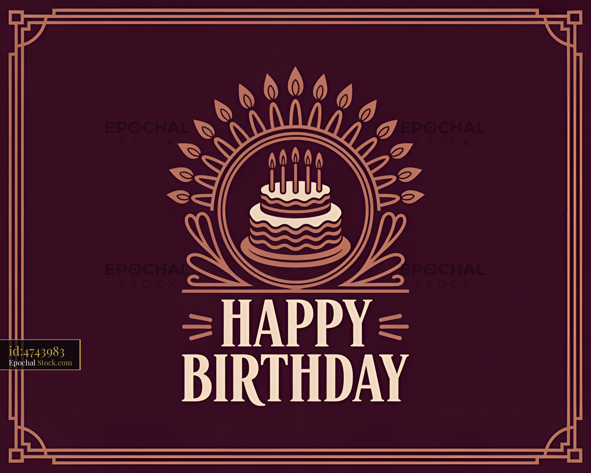 A birthday celebration is shown with a cake in the center. The cake has candles on top. The words happy birthday are displayed below the cake. The background is dark with a decorative frame.