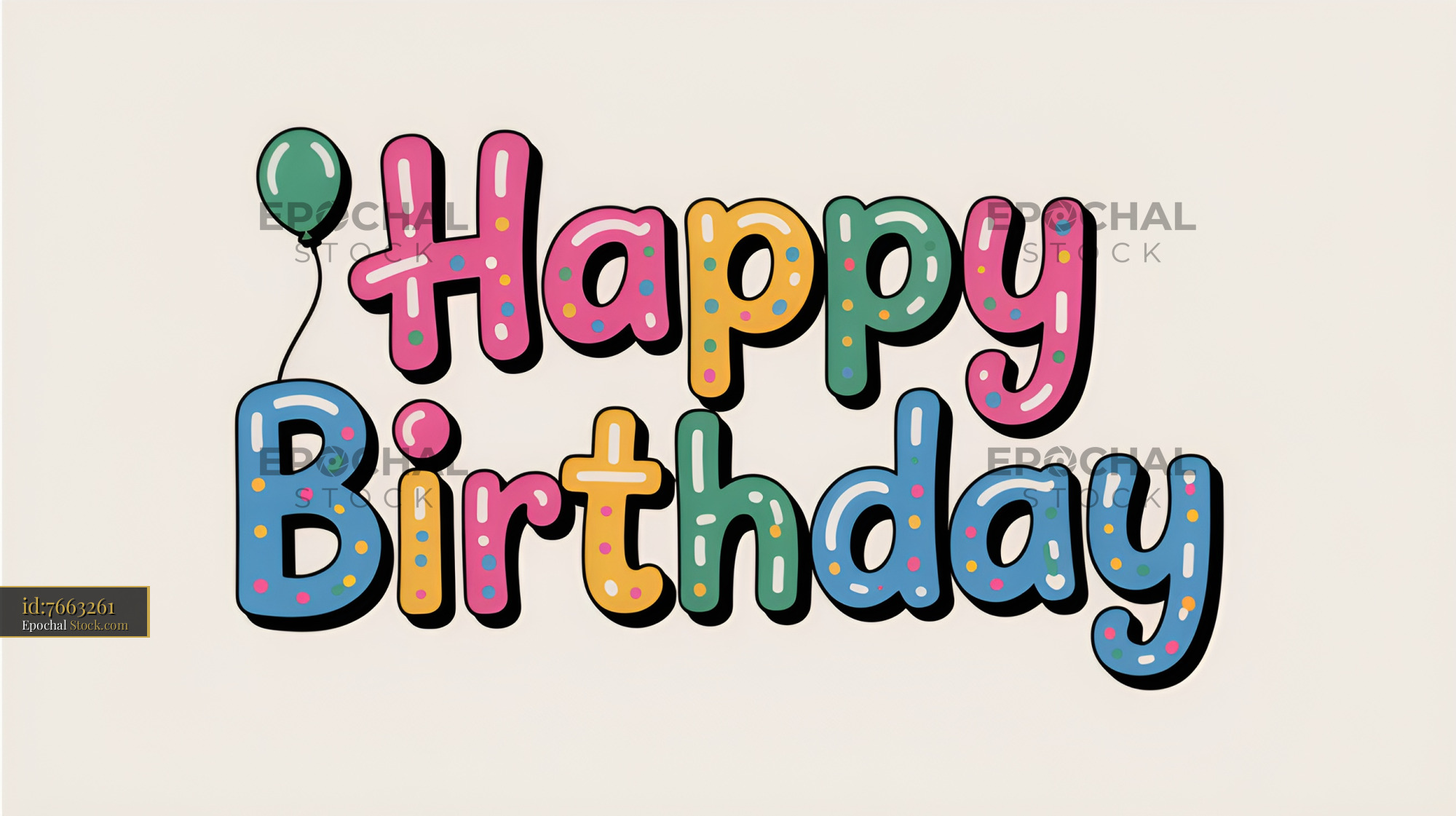 The design shows colorful letters spelling happy birthday. There is a balloon attached to one of the letters. The background is light, creating a cheerful look suitable for celebrations.