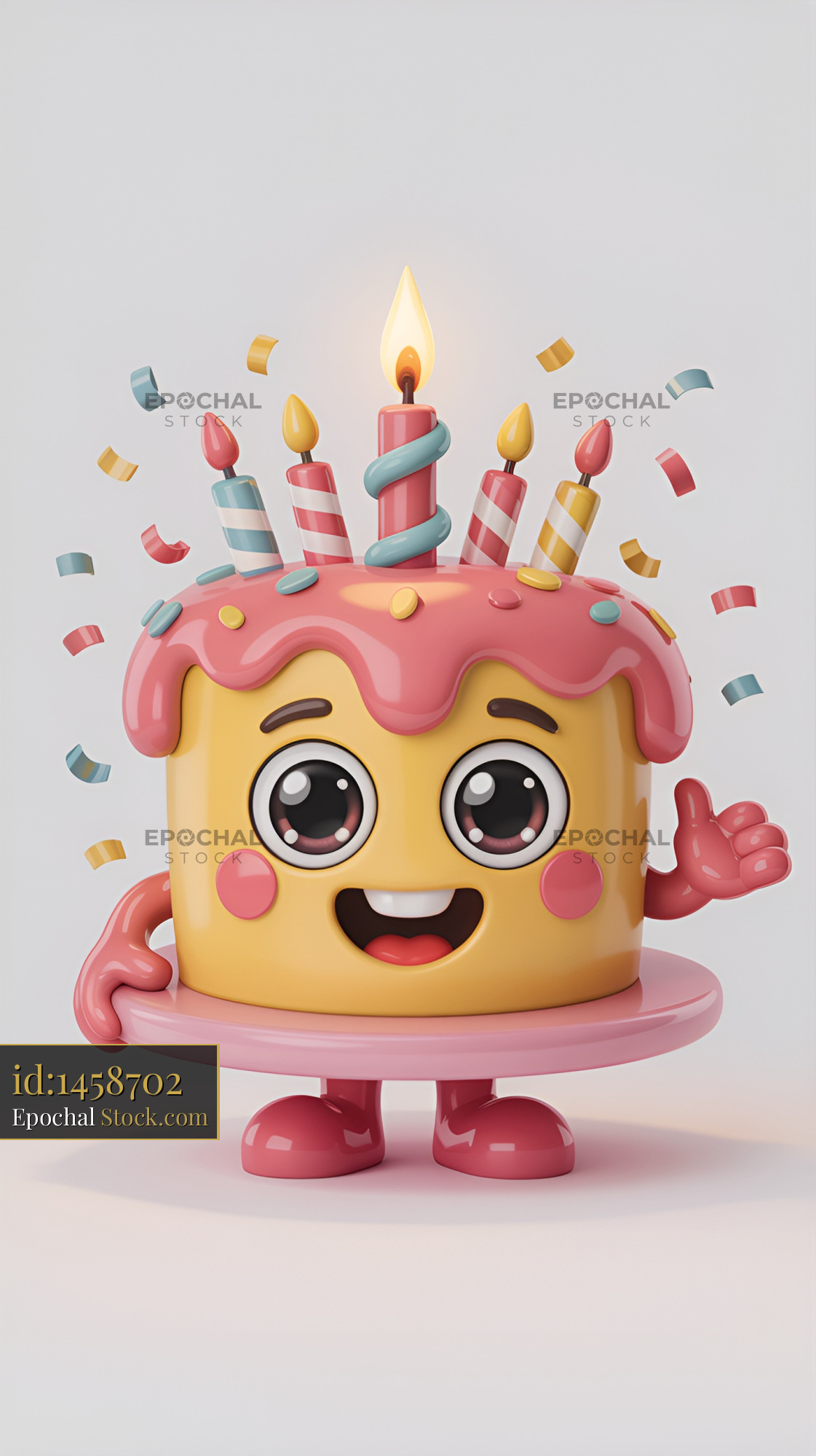 A cartoon cake stands on a plate. It has a big smile and two wide eyes. Colorful candles sit on top, with confetti around it. The cake is ready for a birthday party.