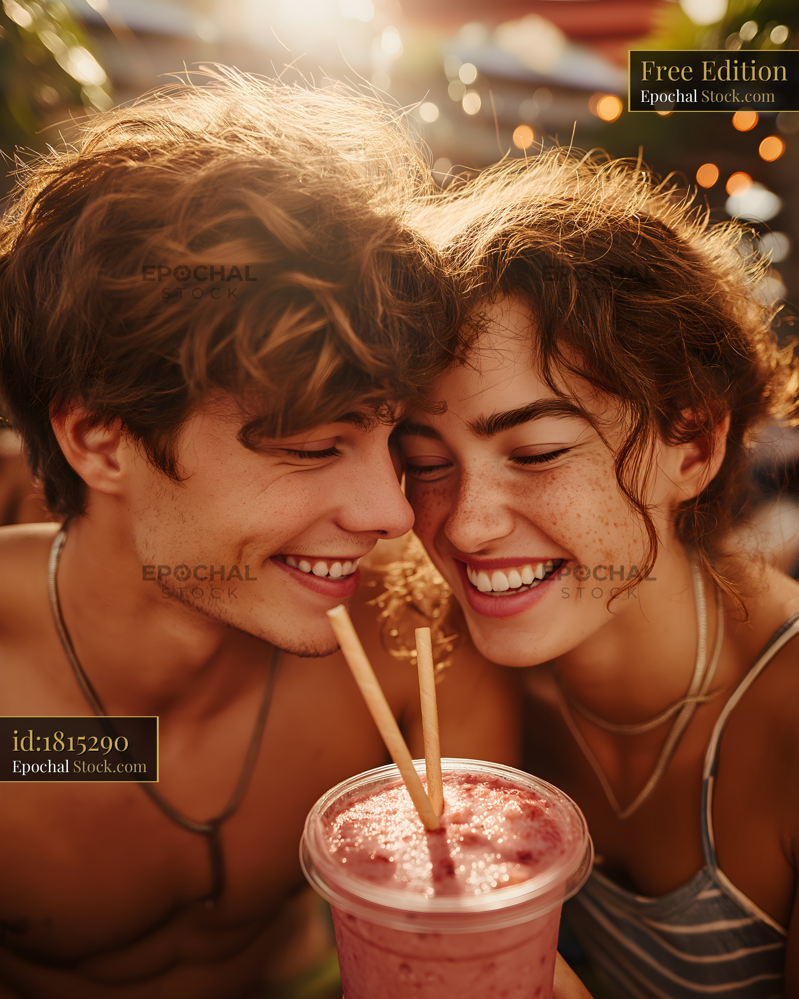 A young couple is close together, smiling and laughing. They hold a smoothie with two straws. The setting has warm lighting from the sun.