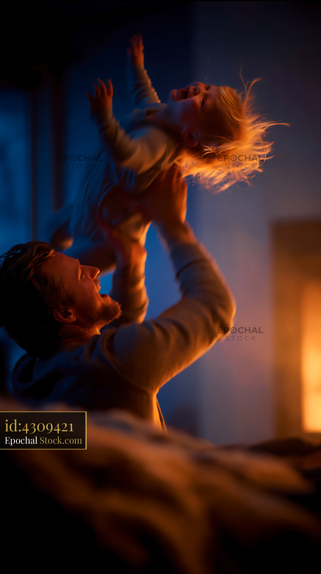 A father and his young child share a moment of pure joy and playfulness by the warm glow of a fireplace at night, capturing the essence of paternal love and family bonding.