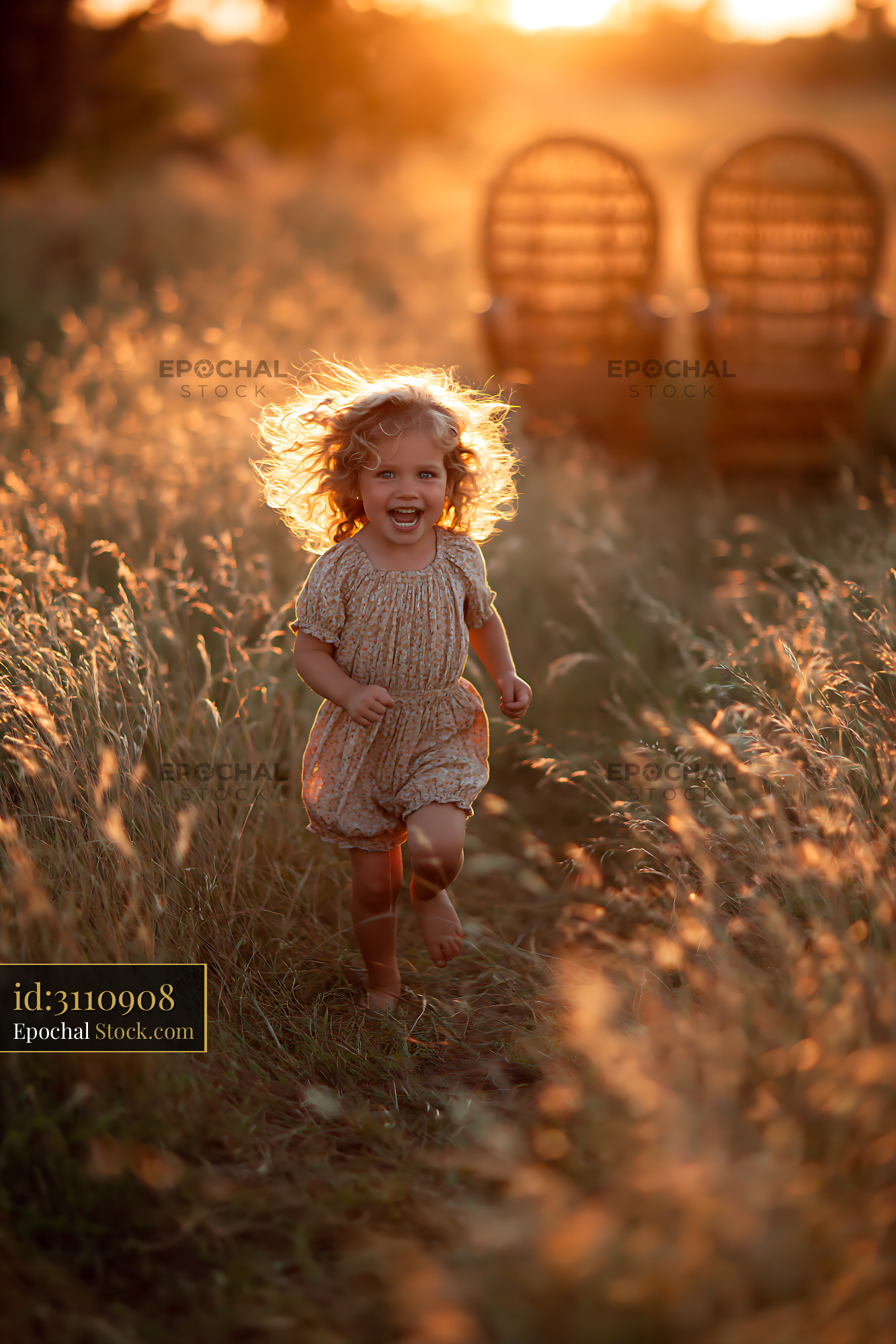 Happy little girl with curly hair running through a golden meadow