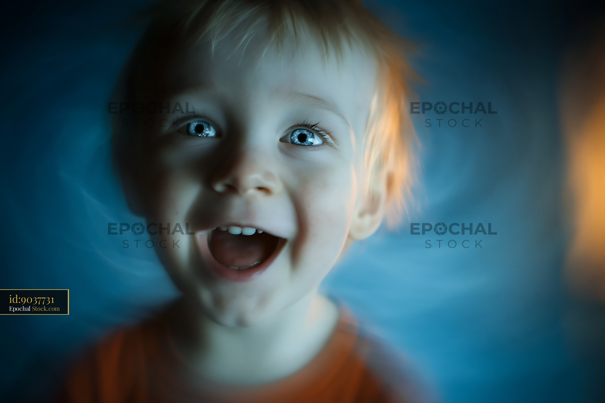 Happy toddler boy with bright blue eyes laughing in magical light
