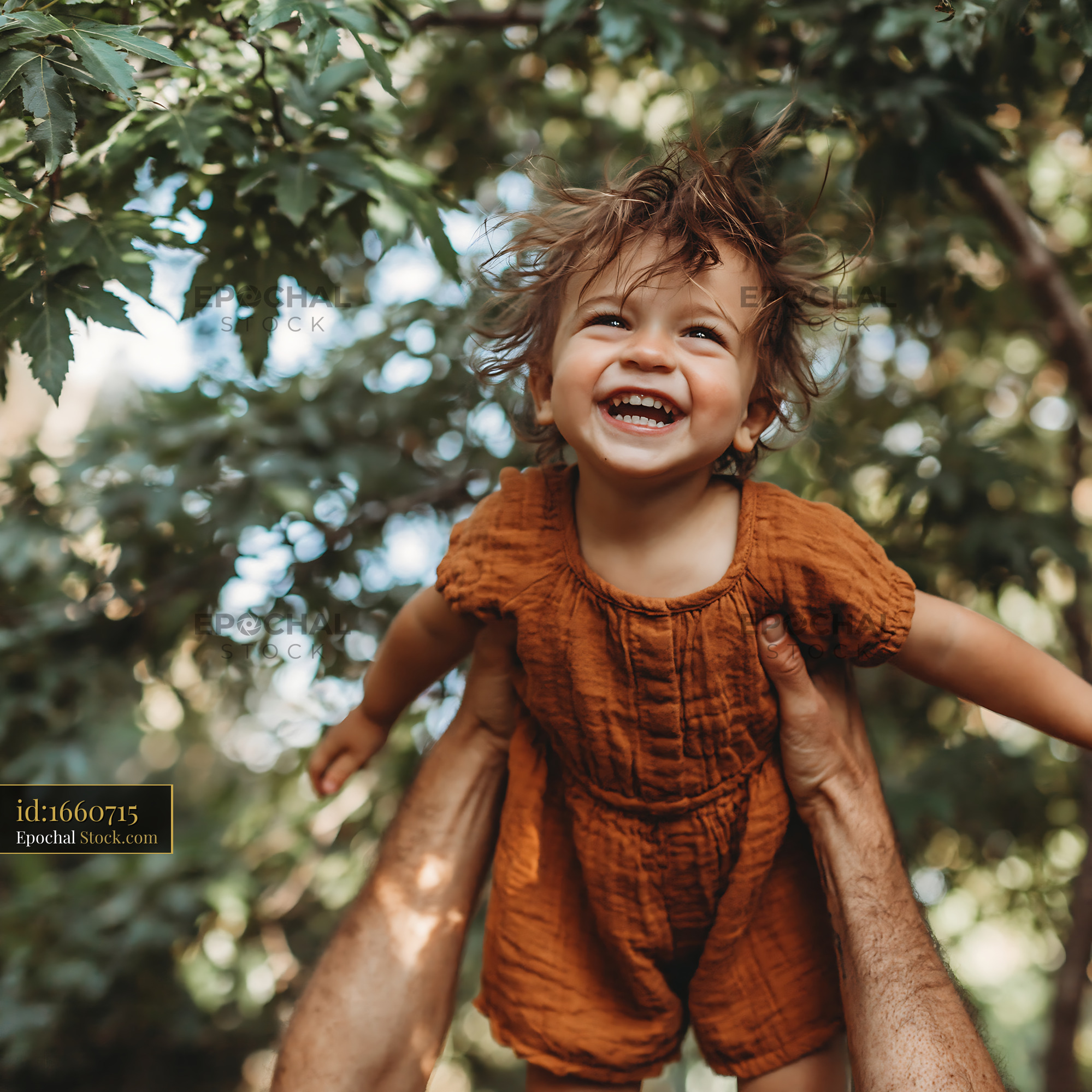 A joyful toddler girl with messy hair laughs as her father lifts her high into the air. This heartwarming scene captures the pure bond, trust, and playful love between a parent and child.