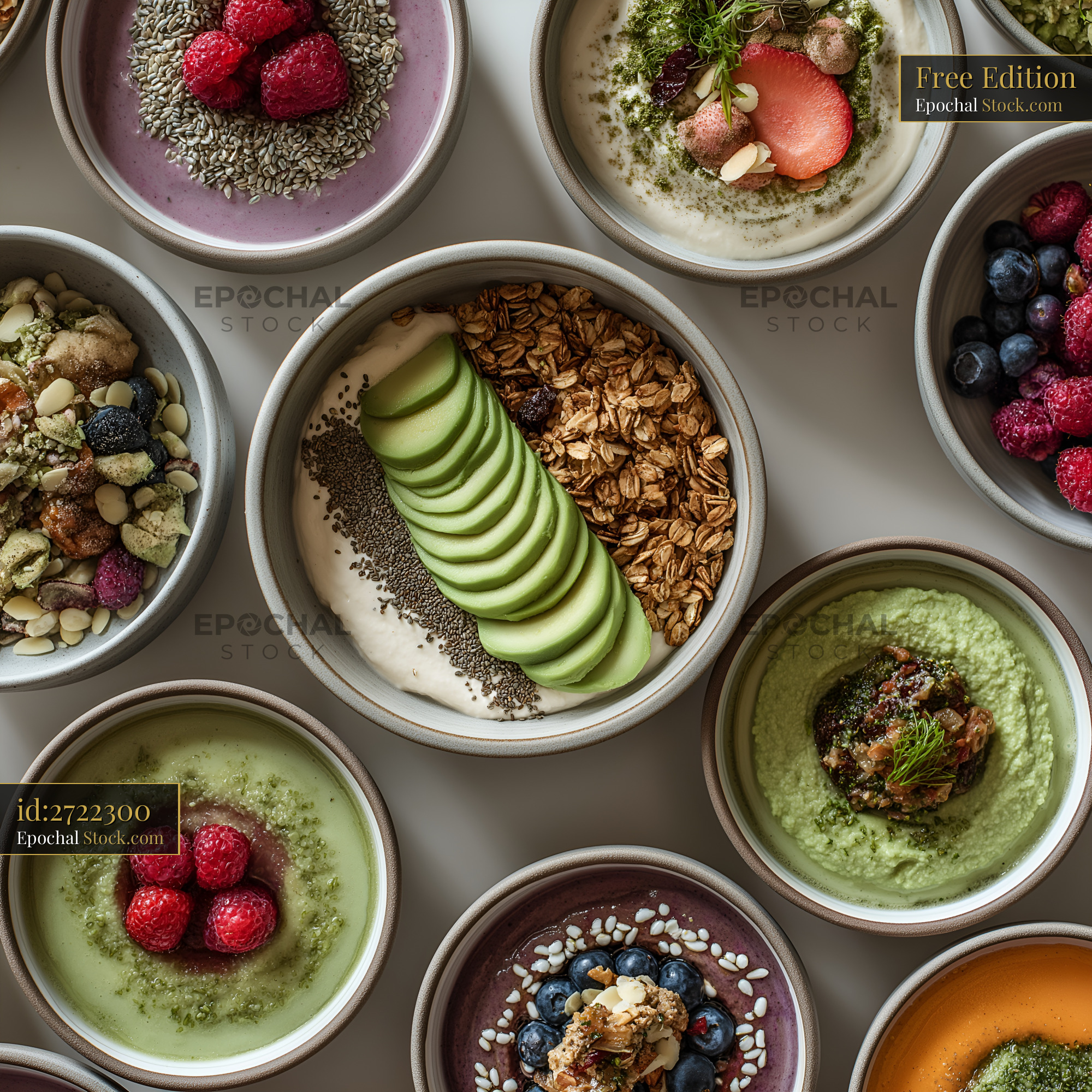 Healthy bowls of yogurt with fruits and toppings in a layout Free Premium Stock Photo