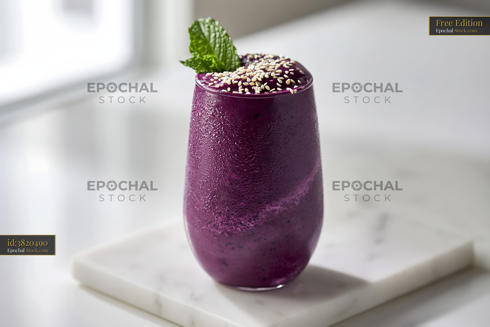 A refreshing purple sweet potato smoothie in a chilled glass, garnished with sesame seeds and fresh mint on a marble base, representing a vibrant and healthy superfood lifestyle.